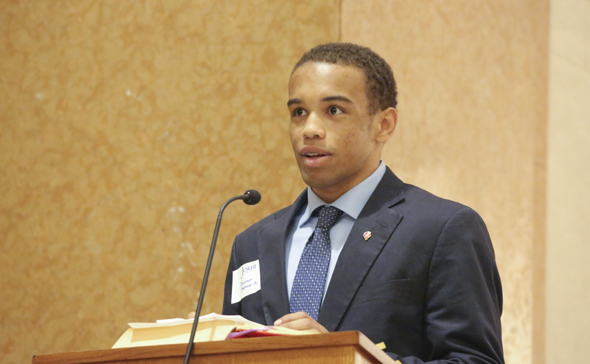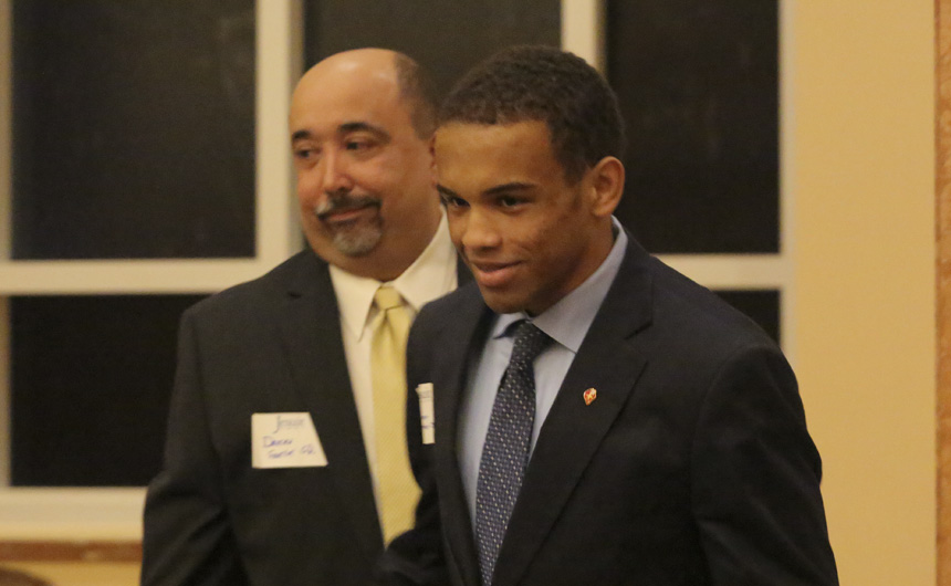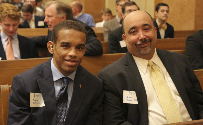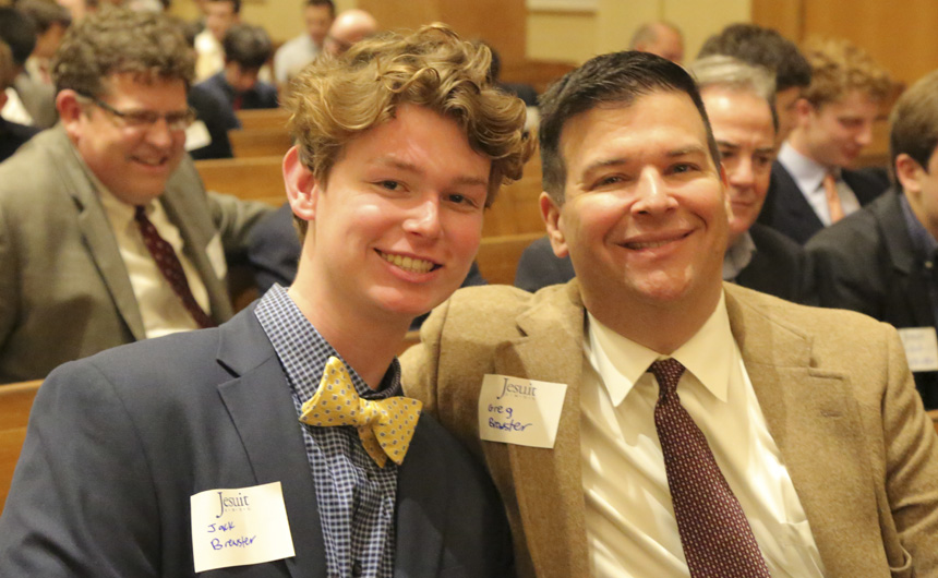 Senior wrestler DJ Ferrier did, but not intentionally, he explained in his tribute to his father Darren Ferrier. “I had some regrets [about missing four years in a row], but then I started to remember what those Saturdays usually entail, what stars had to align just to sneak in a few hours of father-son bonding,” DJ said before noting that wrestling tournaments always conflicted with Jesuit’s Father-Son event. Mr. Ferrier smiled as he watched his son on the chapel podium, just as he watched his son for all those Saturday wrestling tournaments.