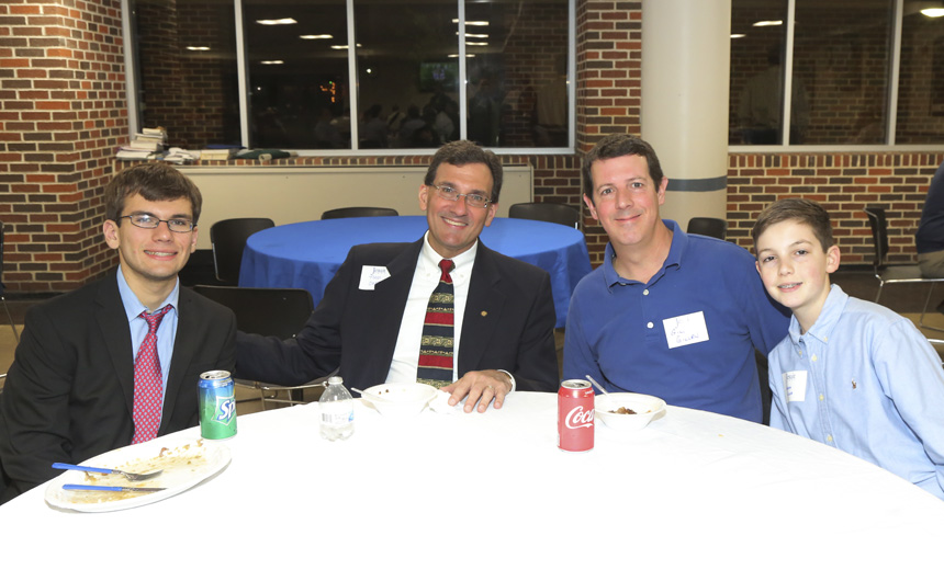 Stark Winston (second from left) with his sons Connor '23 and Chase '20 enjoy their post-meal time with Patrick Gillen '20 and his father Glenn '88. -