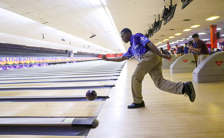 Jake Stiegler makes it look easy as he guides his ball to the pins. -