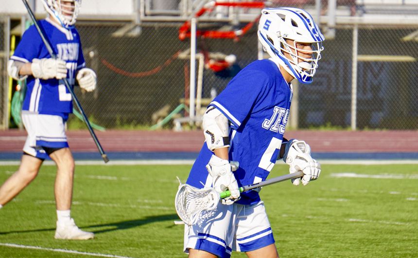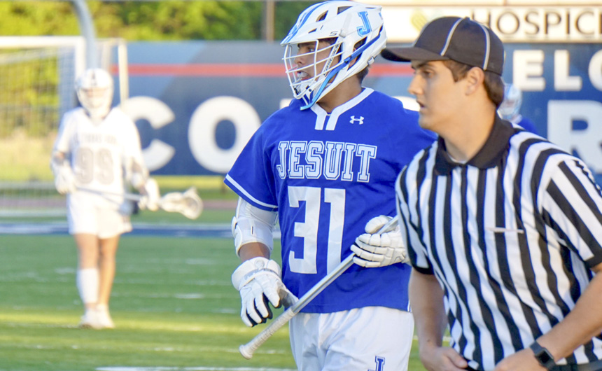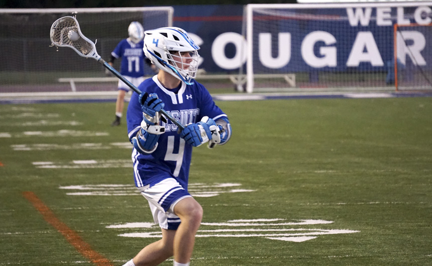 The Jesuit varsity lacrosse team protected its 7-0 first half lead to capture a 15-5 victory over the St. Thomas More Cougars at Muss Bertolino Stadium on Thursday, March 21. The offense controlled possession resulting in two goals for senior attack man, Ross Champagne, followed by a goal each for Clark Romig and Andrew Brown all in the first quarter.