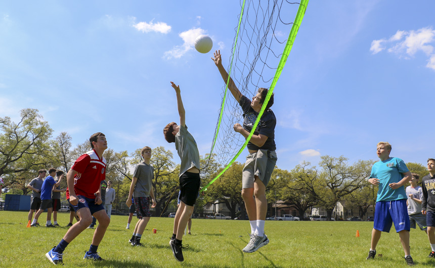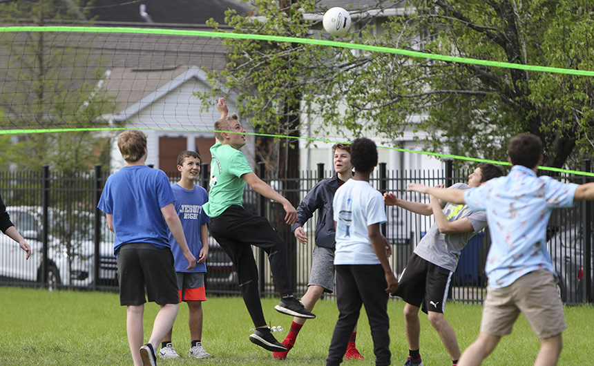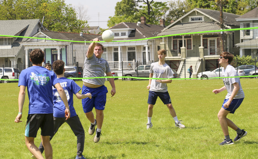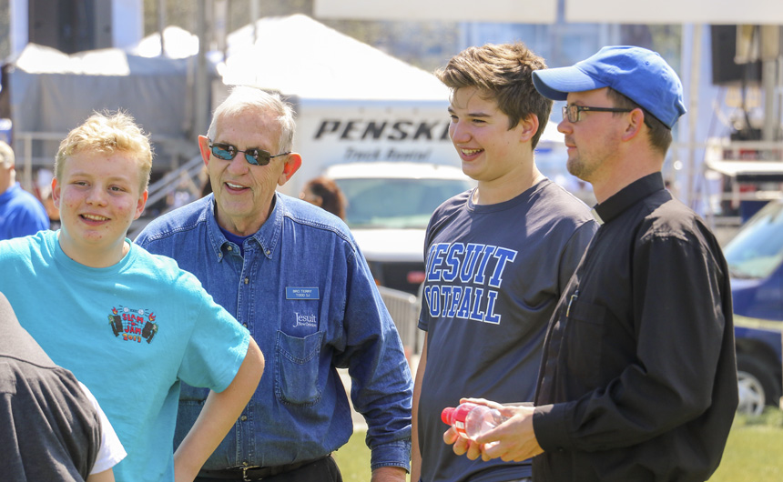 Students, faculty, and Jesuits (like Br. Todd and Fr. Dyer) enjoy the volleyball entertainment on Will Clark Field. -