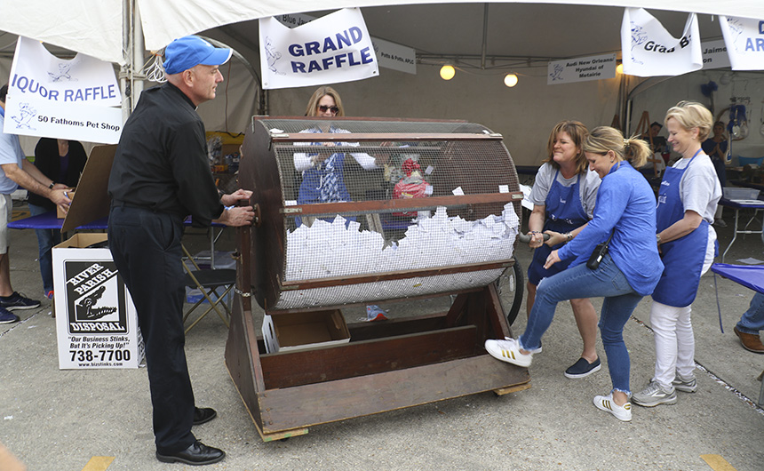 Bazaar leaders assist Fr. Fronk in pulling the winning raffle ticket! -
