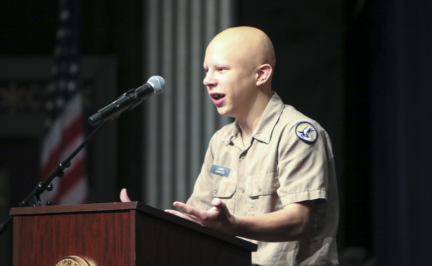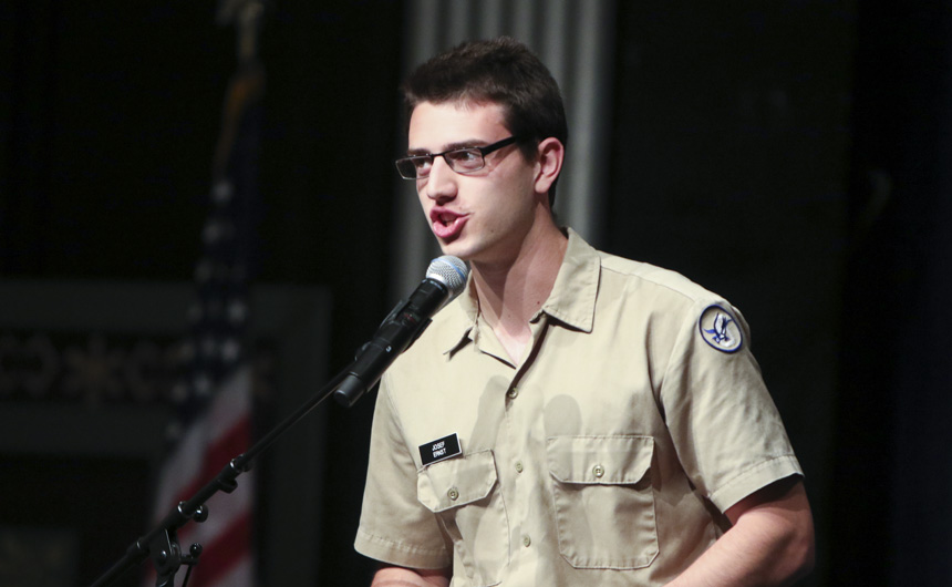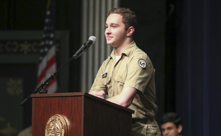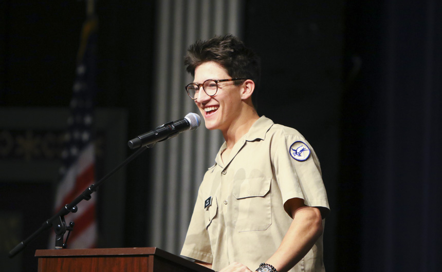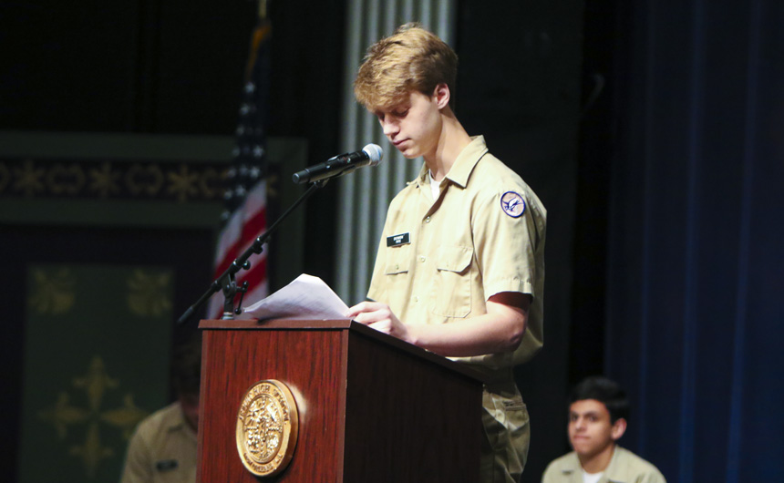 Student body president Dowen Fife, the emcee for the assembly, reads from the Student Council Constitution. It states that the student council executive board is important in “preserving school spirit, instilling values of Christian leadership through service, and sponsoring social events for the student body." -
