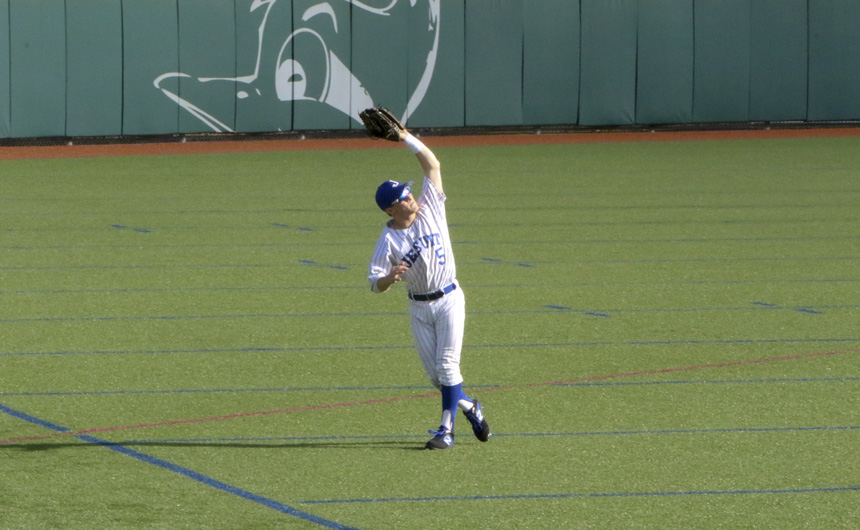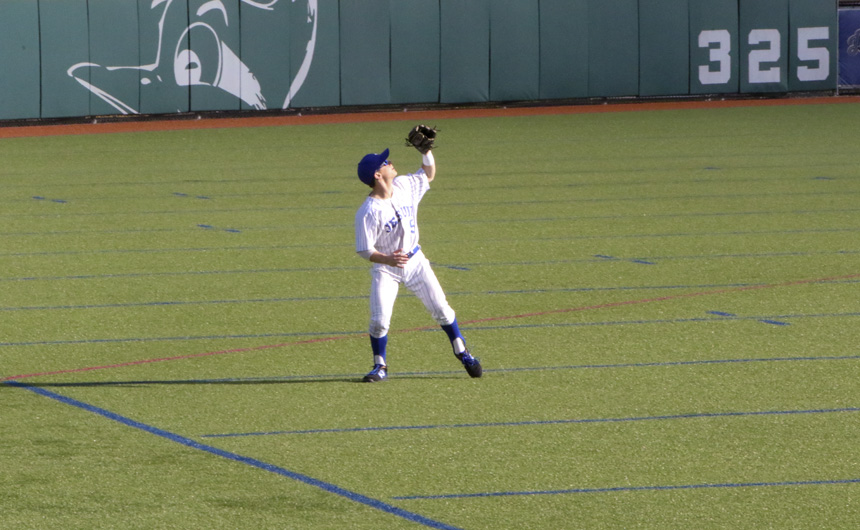 Left fielder Brian Valigosky catches the final out of the inning in Game 2 at John Ryan Stadium on Monday, April 8. -