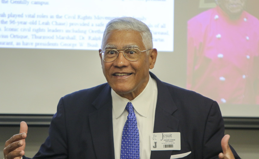 Edgar L. “Dooky” Chase III ’67 gave an enthusiastic presentation to members of the St. Peter Claver Club as well as interested students and faculty on Thursday, April 11. Jesuit’s 2012 Alumnus of the Year used the life of the club’s namesake to segue into a variety of topics, all geared to inspiring students to live a life more like St. Peter Claver.