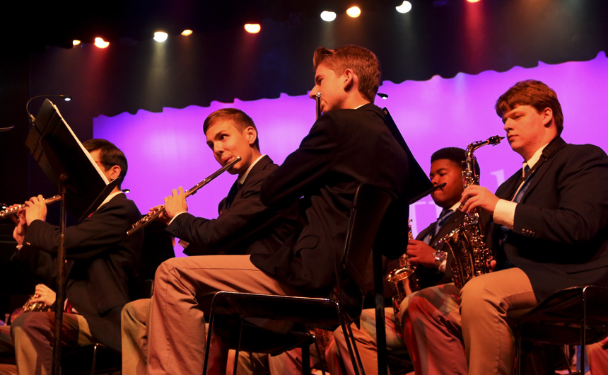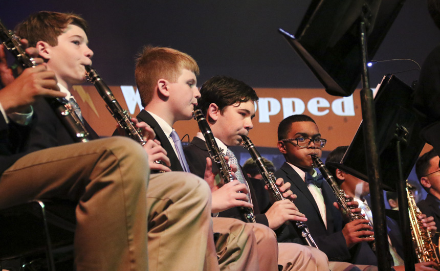 Pre-freshmen Samuel Hunter, Andrew Davis, and Ronnie Reeb with freshman Michael Nair on the clarinet. -