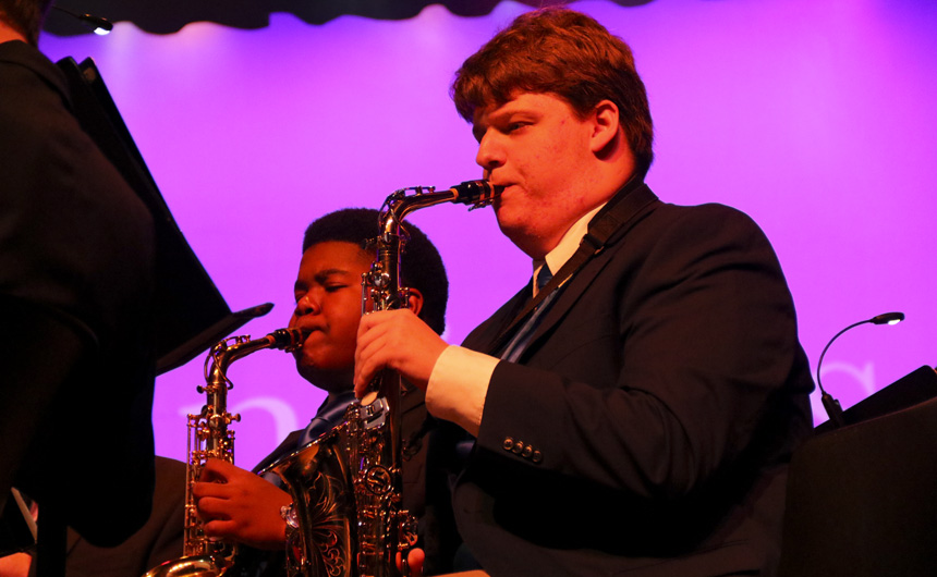 Freshmen Mitchell Stevens and junior Joseph Grana on alto saxophone. -