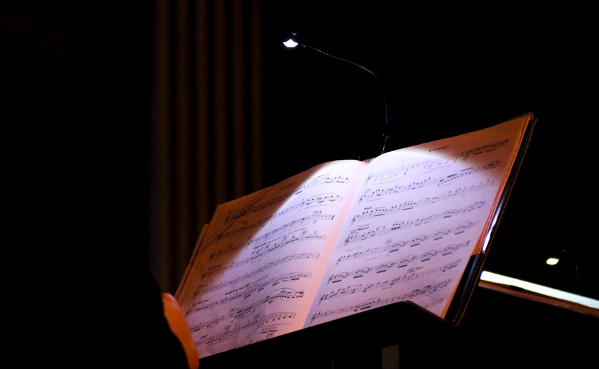 The lights dim as the band prepares to play the next piece. -