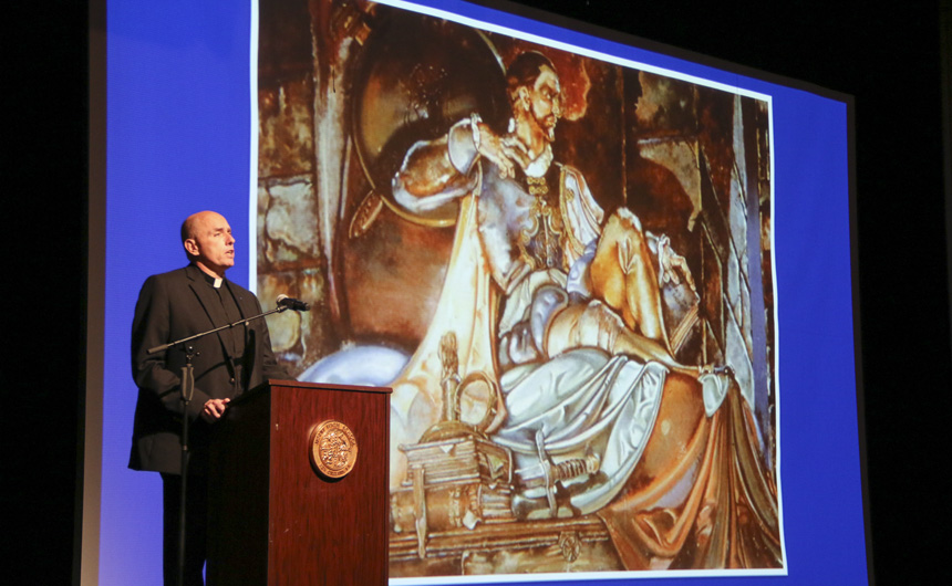 Fr. Christopher Fronk, S.J., speaks to new students and parents about the history and mission of the Society of Jesus. -