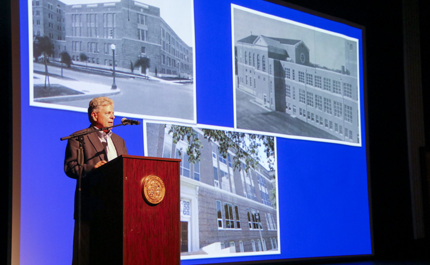 Alumni director Mat Grau '68 tells the parents about historical developments to Jesuit's campus and exciting future plans. -