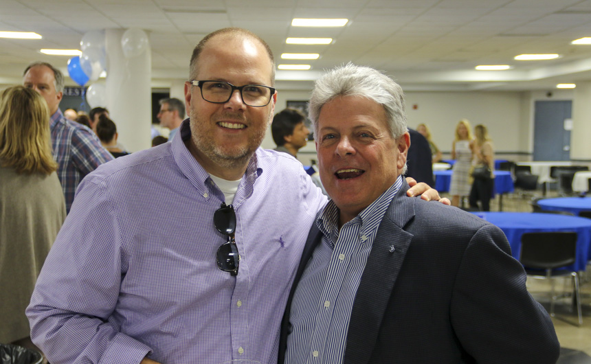 Alumni director Mat Grau '68 visits with his son, Ben, who is a parent of a new Blue Jay. -