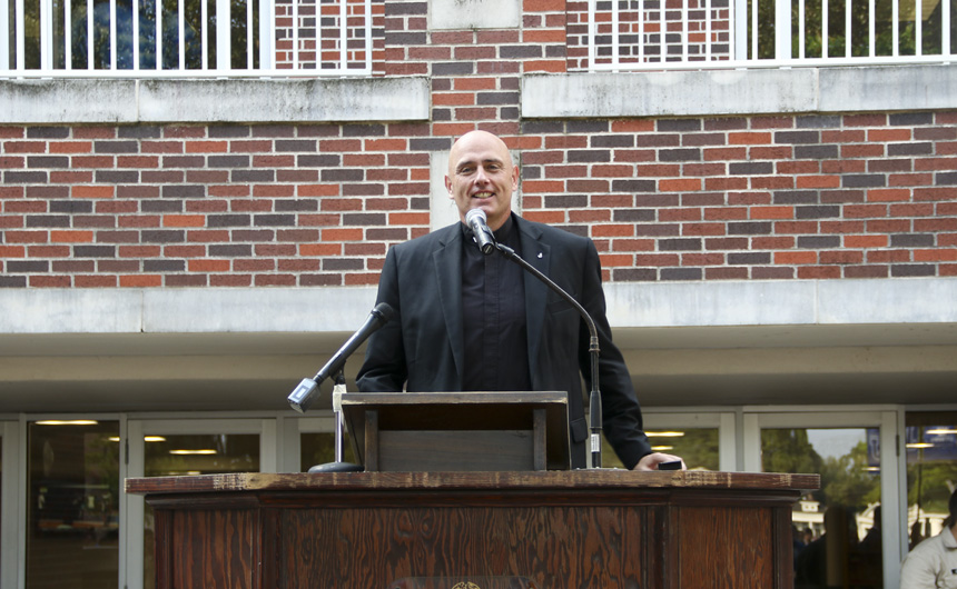 President Fr. Christopher Fronk, S.J. greets students and welcomes them back to school. -