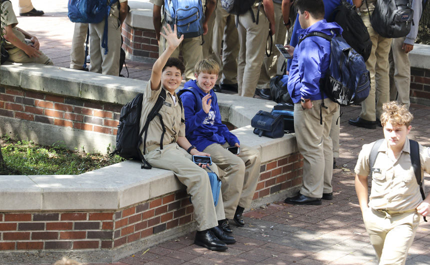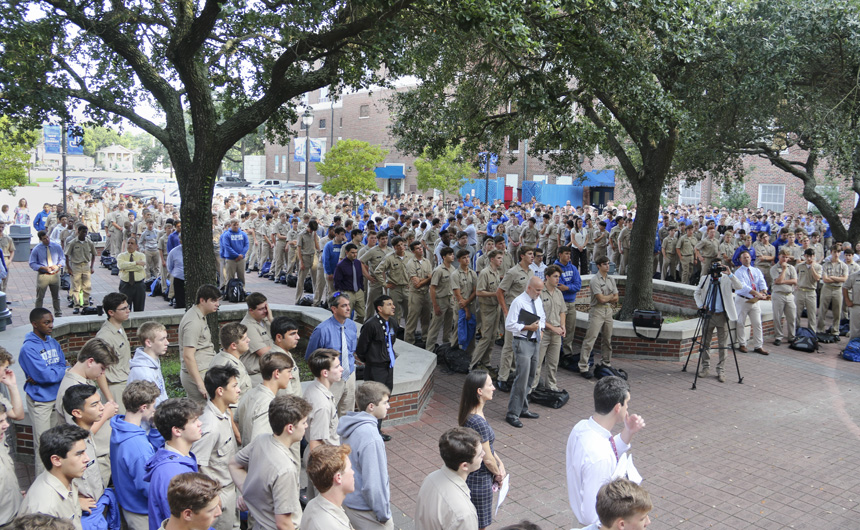 The Jesuit High School community came together at Friday Morning Assembly (Aug. 16) in Traditions Courtyard to hear two addresses that set the tone for the 2019-2020 school year. With seven periods of classes ahead, Blue Jays lined up with their respective homerooms in orderly fashion. After opening prayer and the Pledge, students saw the normal progression of assembly before school principal Peter Kernion ’90 and Jesuit president Fr. Christopher Fronk, S.J. took to the podium.