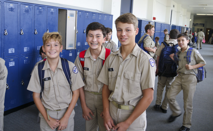 Pre-freshmen Jackson Freaner, Nicolas Navarro, and Omar Hassan exit the 4th floor hallway after their first full day at Jesuit.