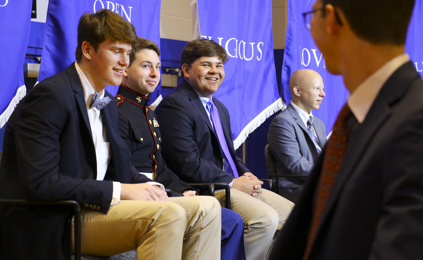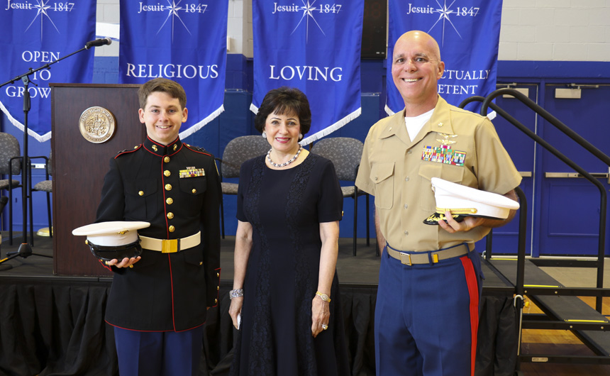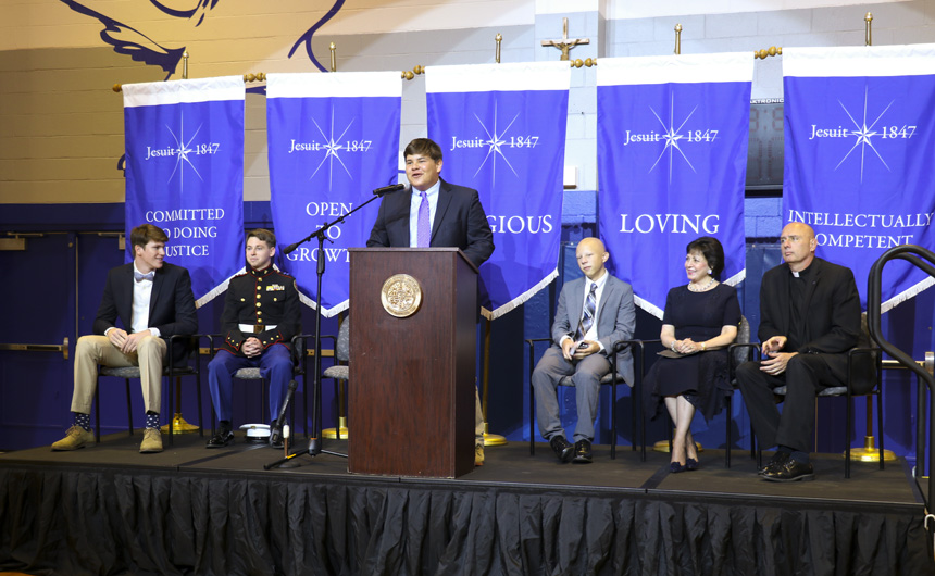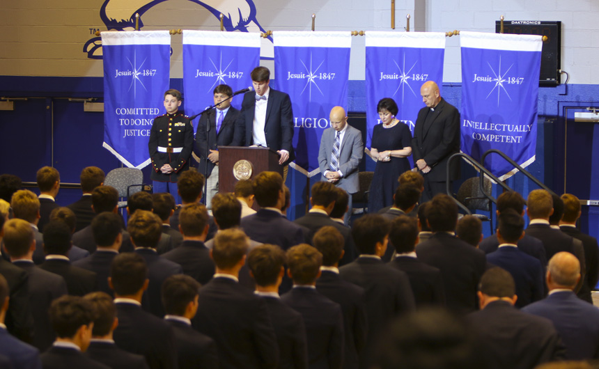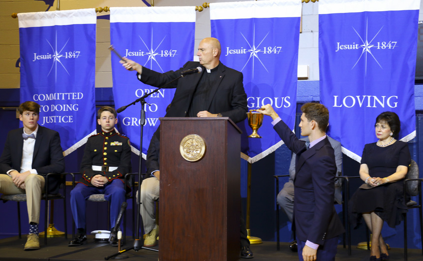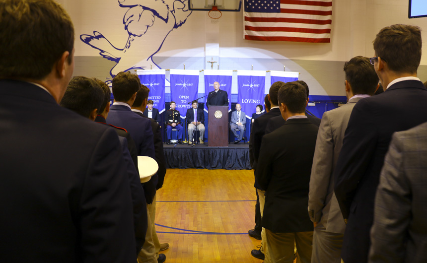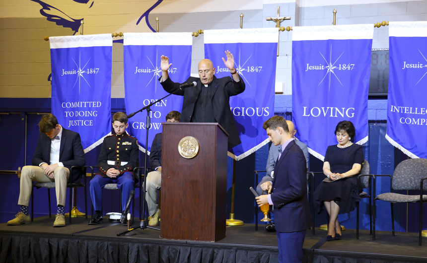 The dedication began with a prayer by senior Myles Gordon, followed by the pledge of allegiance led by the MCJROTC student commander, senior Dylan Blady. After announcements and results, Jesuit president, Fr. Christopher Fronk, S.J., addressed the assembly.