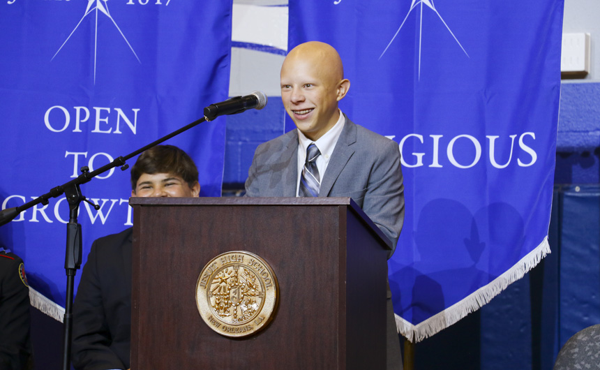 At a special morning assembly held in the newly-renovated Gayle and Tom Benson Arena, the school community gathered to dedicate the arena in grand style. The assembly welcomed Mrs. Gayle Benson, who was present to visit with the excited students and faculty. Mrs. Benson was joined by Saints and Pelicans team president Dennis Lauscha ’87, vice president for communications Greg Bensel ’80, and vice president of business operations Steven Pate.