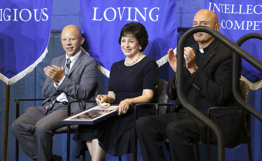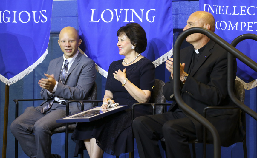 Fr. Christopher Fronk, S.J., Mrs. Gayle Benson, and senior Nathan Hannan -