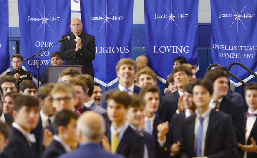 Then Jesuit president, Fr. Christopher Fronk, S.J., addresses the assembly saying, "Jesuit's rich tradition, which spans more than 170 years, tells the stories of thousands of Blue Jays who have lived lives of service to their neighbor and to God. Our school has been and will continue to be an anchor in this community. But I believe our best years are ahead of us. This capital campaign will allow us to reach new heights as a school community." -