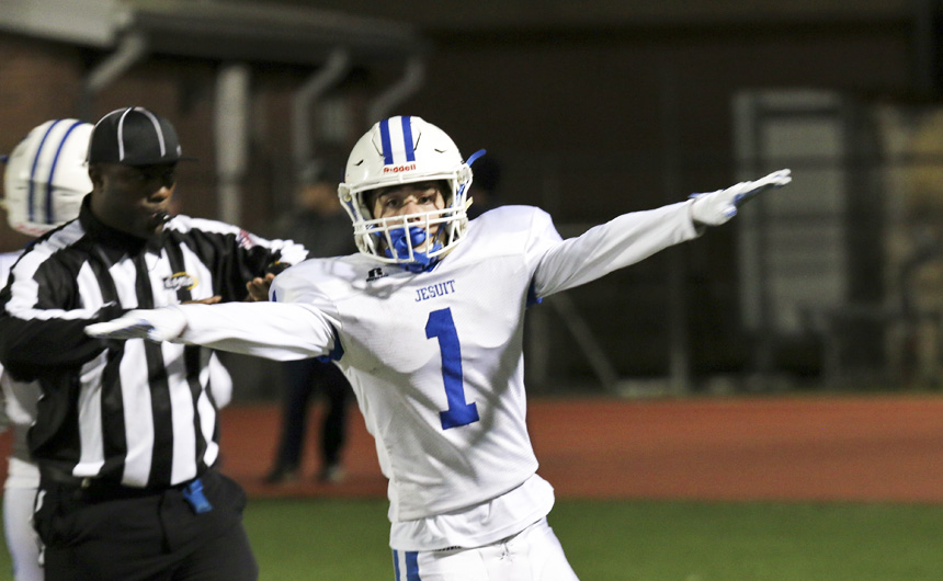 Senior quarterback Grant Jordan went 4-for-4 on the opening drive that covered 52 yards in seven plays, and he didn’t need to use his legs to find the end zone. Rather, running back Radar Jackson earned himself a key highlight by running 18 yards up the middle for the game’s opening score. On the next possession, kicker Aidan Corbello hit a 29-yard field goal to complete a nine-play, 65-yard march. At halftime it was 10-0, Jesuit.