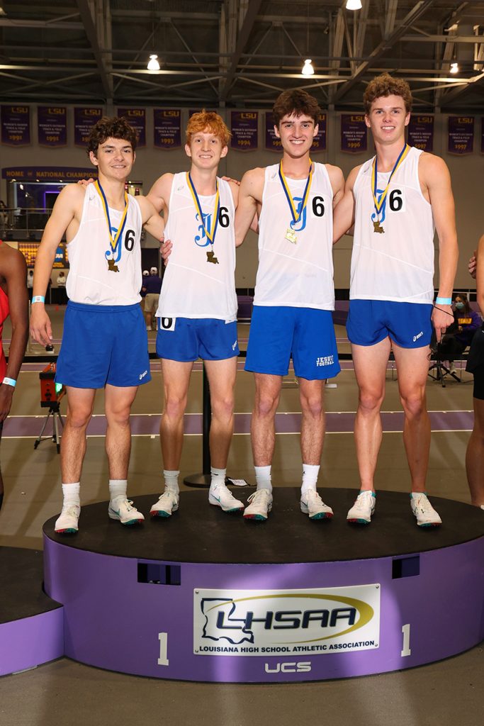 With the purple and gray striped track of LSU’s Carl Maddox Fieldhouse under their feet, four Blue Jays accelerated their way to state champions in the 4×800 relay at the LHSAA Indoor Track & Field State Meet on Sat., Feb. 21.