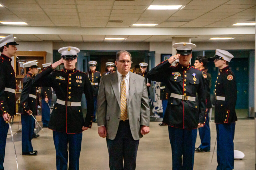 On November 16, 2021, the Jesuit MCJROTC ,their families, and guests gathered in the Student Commons to commemorate a special tradition: the birthday of the United States Marine Corps. The 246th Birthday celebration included a performance by the MCJROTC Band (the oldest of its kind in the nation); a traditional cake cutting ceremony with special recognition of the program’s youngest and oldest cadets; and recognition of the guest of honor.