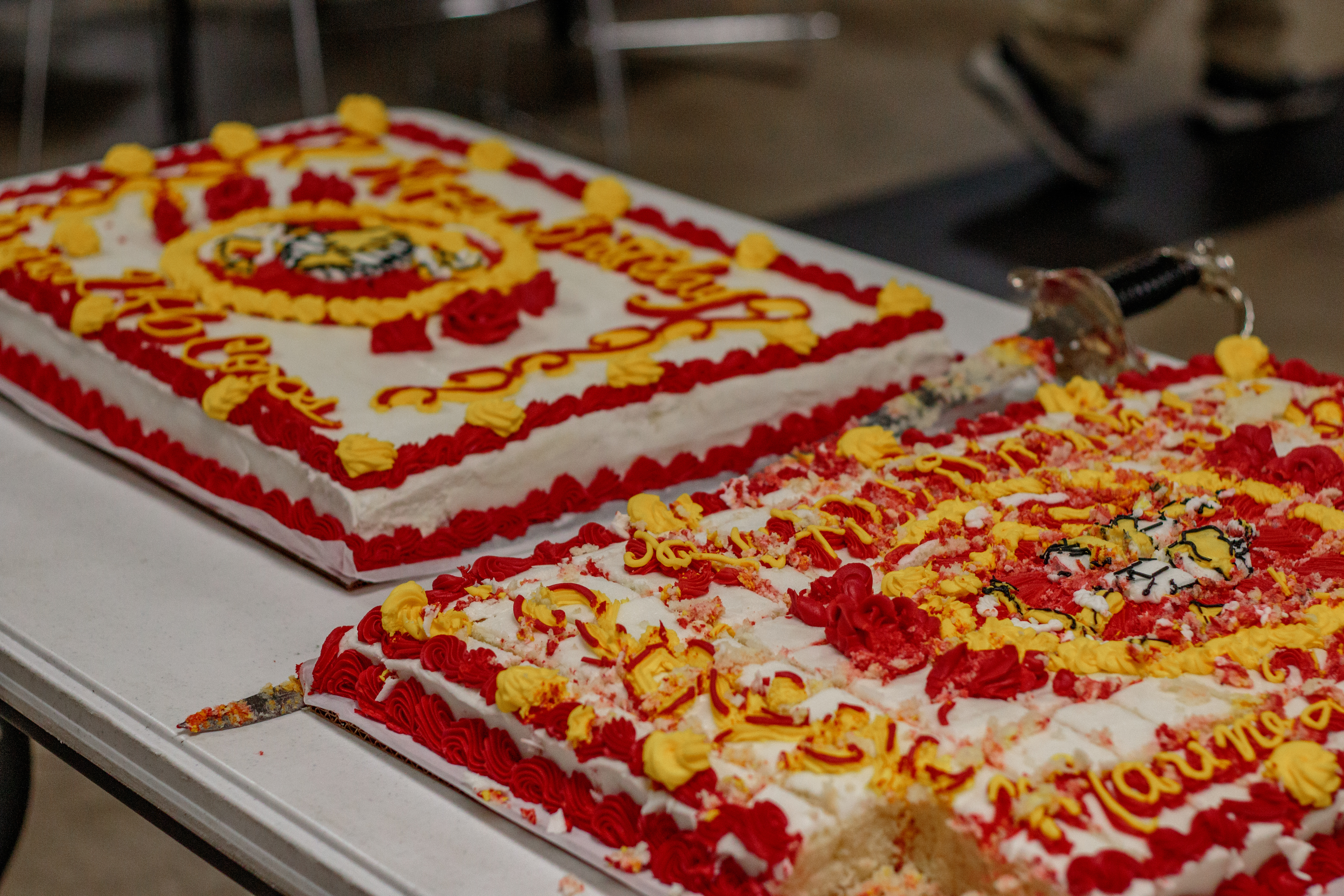 After Songy’s speech, the cake cutting part of the program took center stage. Tradition holds that the guest of honor receives the first piece of cake followed by the oldest cadet present and the youngest cadet. For the 2021 school year, Cadet Lieutenant Colonel Joseph Finger, who was born on July 18, 2003, received the second piece of cake while Cadet Private First Class James Breaux, who was born on August 7, 2008, took the third piece.