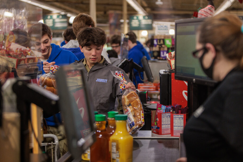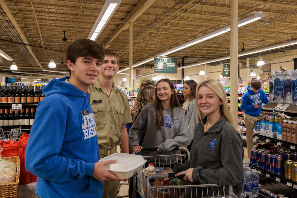 As the sun rose on the Crescent City on the morning before Thanksgiving, the Jesuit community was already in high gear shopping for groceries at Robért Fresh Market on Robert E. Lee Boulevard. Students and faculty arrived around 5 a.m. to purchase perishable food items as part of Jesuit’s annual Thanksgiving Drive. In the preceding weeks, homerooms, clubs, honor societies, and other student organizations collected non-perishable items that were combined together in baskets with turkeys donated by the Class of 1983.