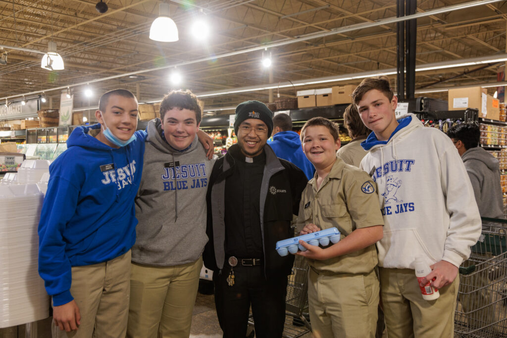 After shopping at Robért’s and arriving back on campus to assemble food into deliverable boxes, students and faculty met in the Chapel of the North American Martyrs for prayer and reflection. The service was led by Fr. Kevin Dyer, S.J., Jesuit’s chaplain, and music was provided by Jesuit’s choir under the leadership of scholastic Jeff Miraflor, S.J.