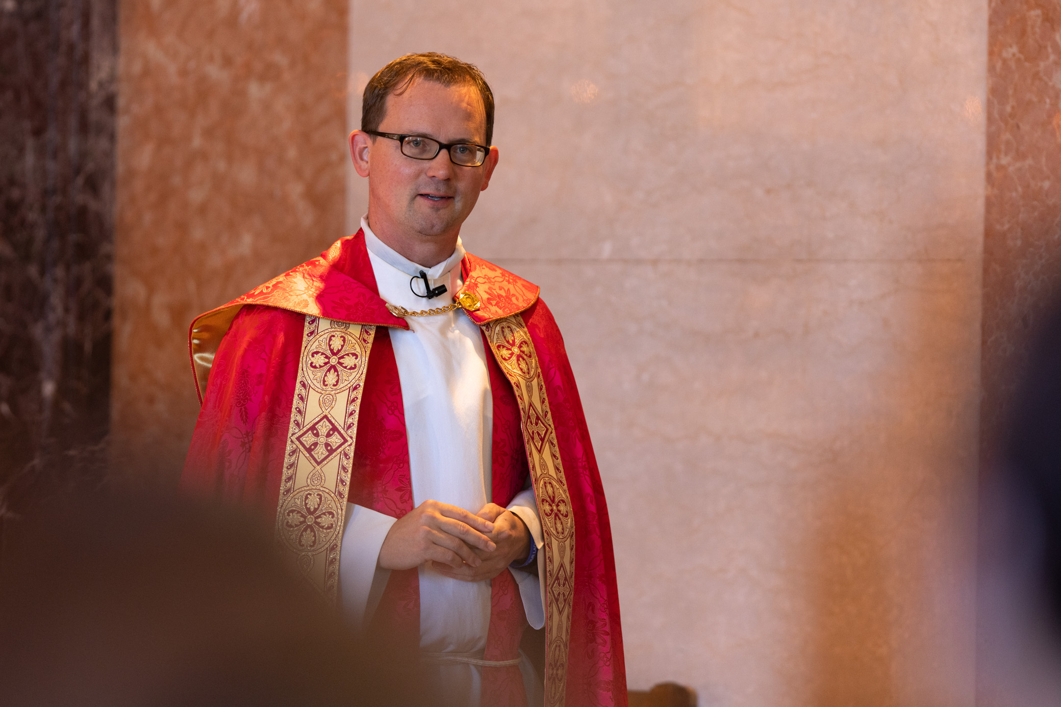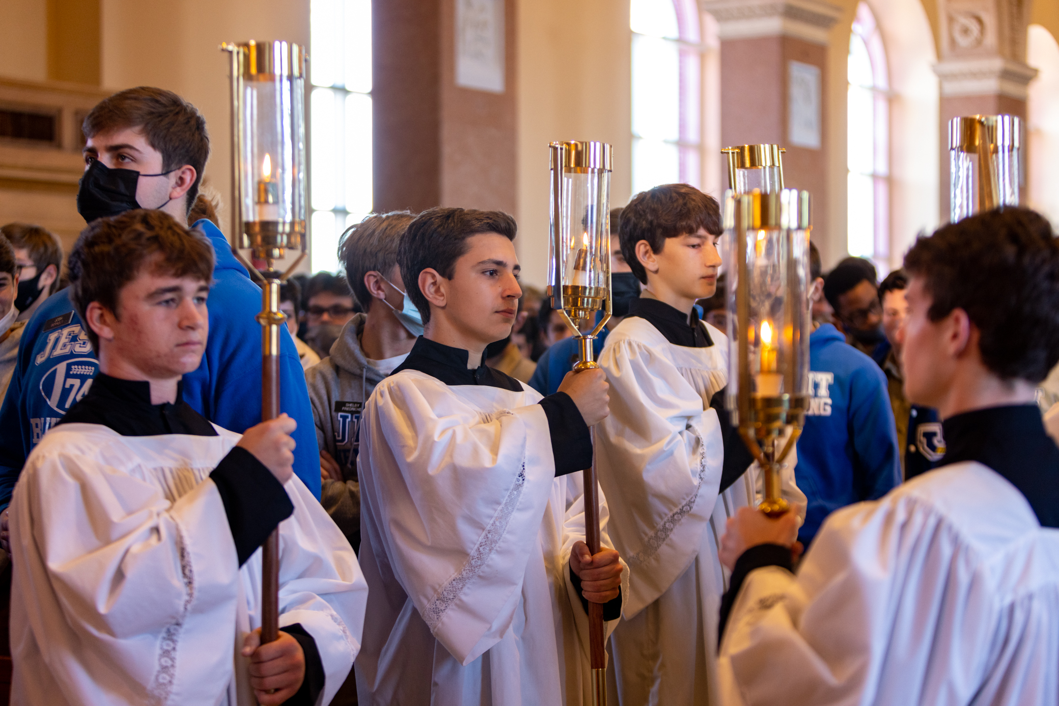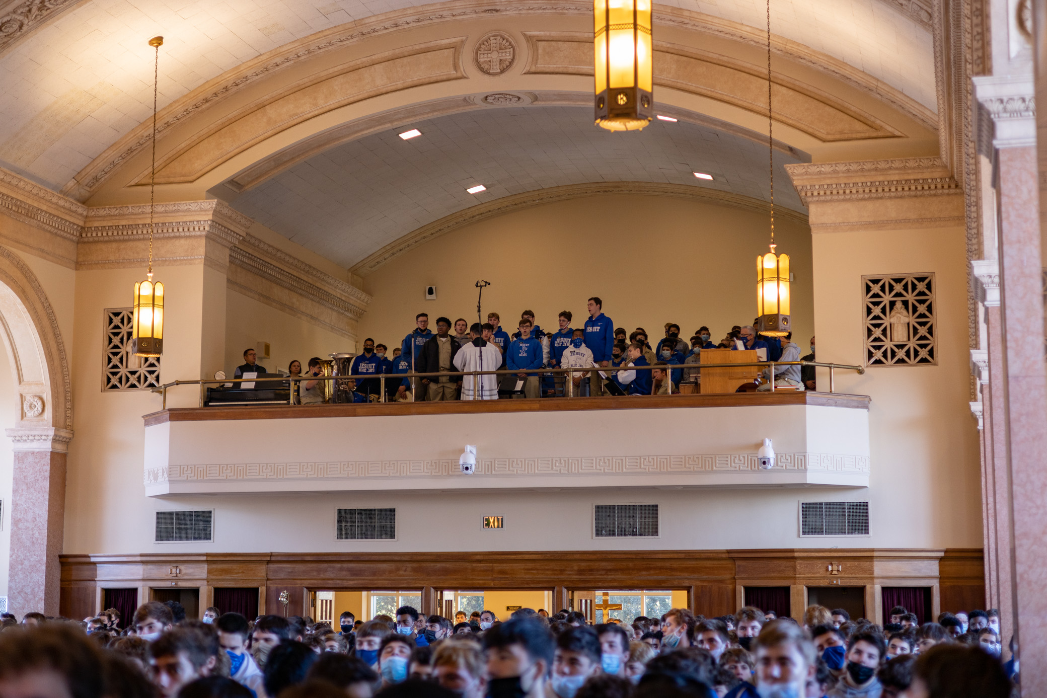After shopping at Robért’s and arriving back on campus to assemble food into deliverable boxes, students and faculty met in the Chapel of the North American Martyrs for prayer and reflection. The service was led by Fr. Kevin Dyer, S.J., Jesuit’s chaplain, and music was provided by Jesuit’s choir under the leadership of scholastic Jeff Miraflor, S.J.