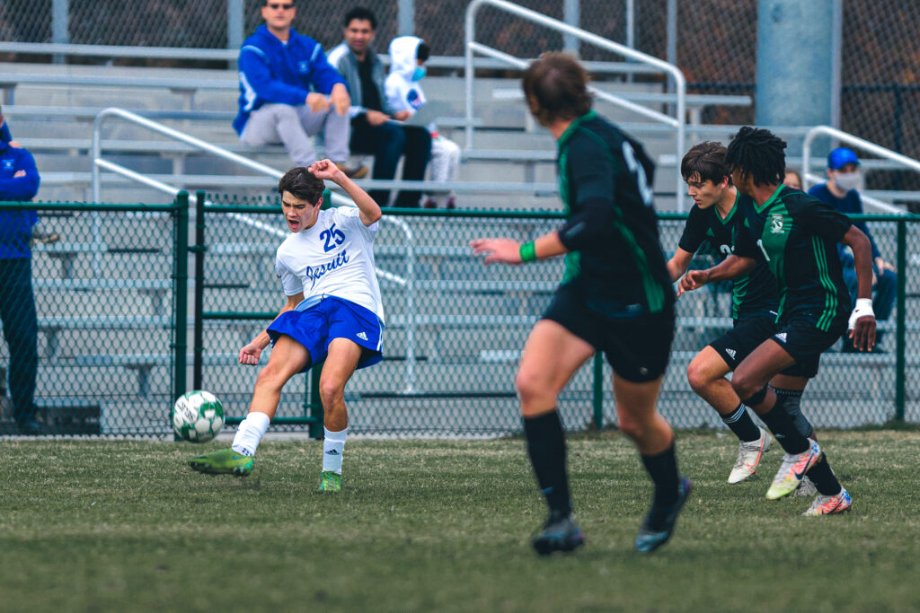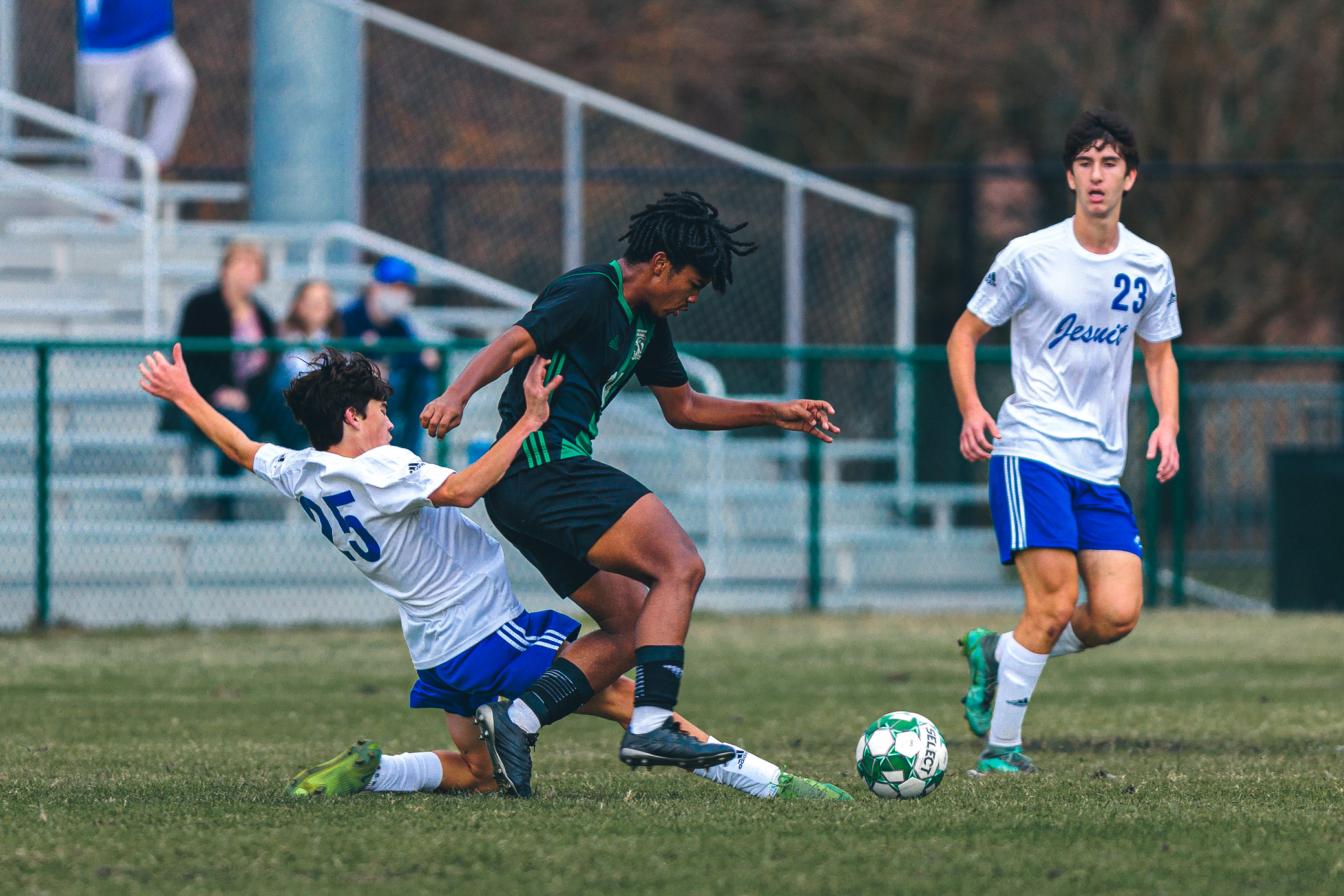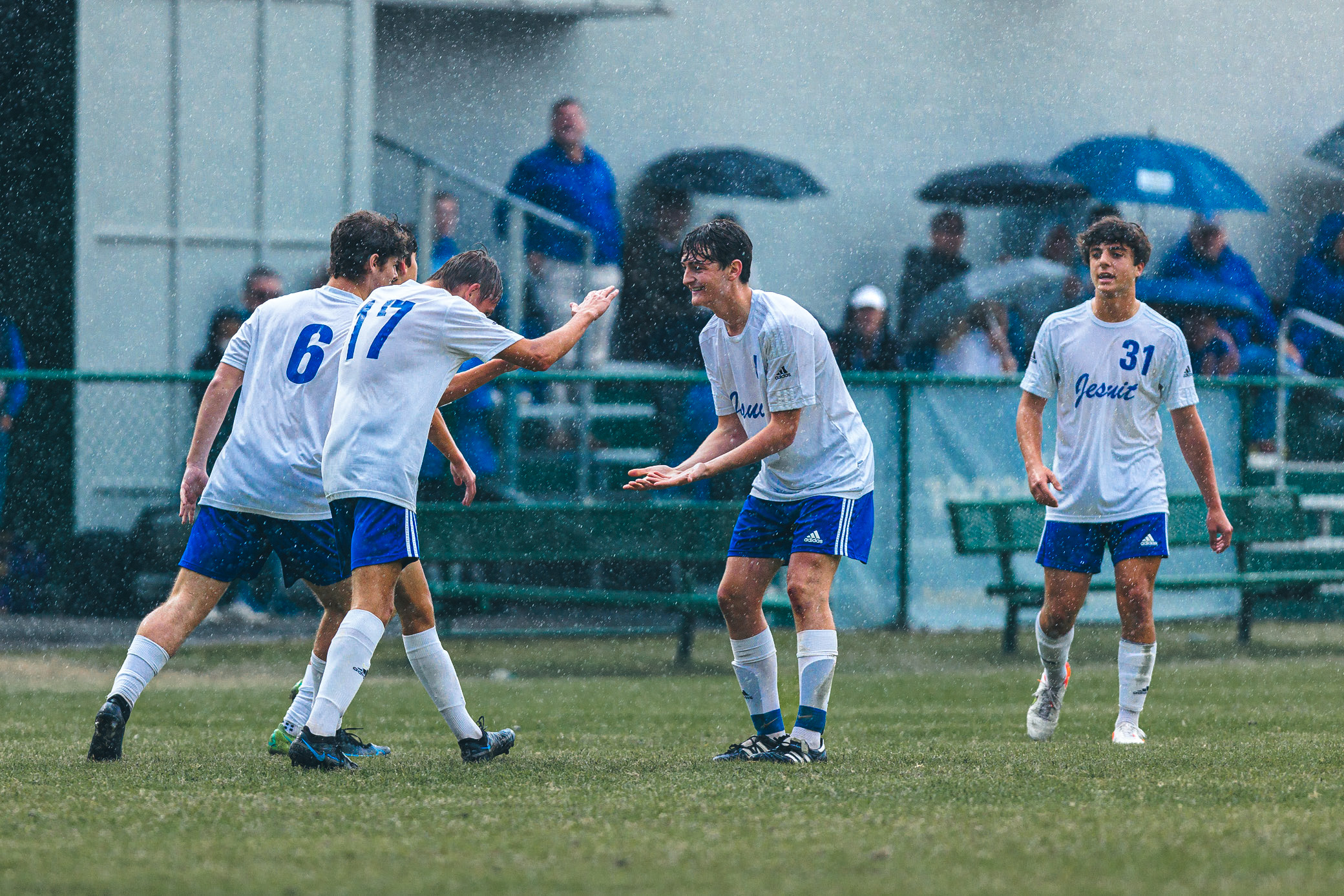 With a cloudy sky giving way to rainy conditions on the field at Benjamin Franklin High School, the Jesuit soccer team (13-2-4) brought home a 3-0 victory against the Falcons on Saturday, January 15.