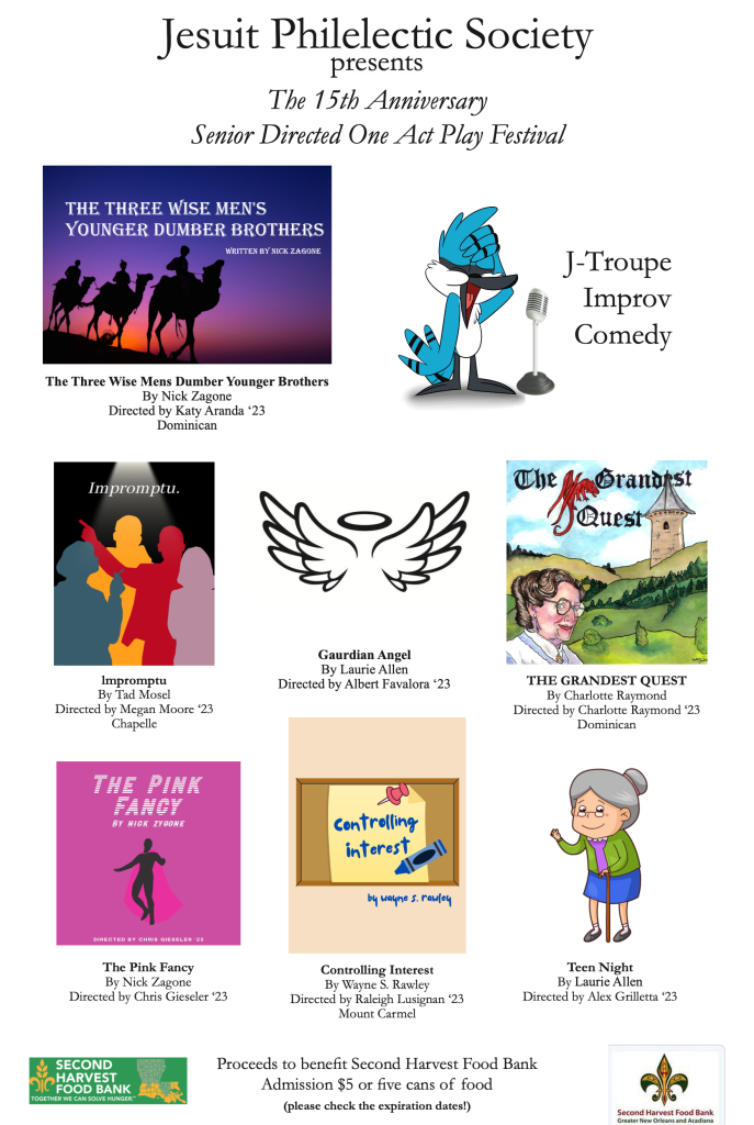 THE 15th Annual Senior-Directed One Act Play and Improv Comedy Festival is this Thursday, Friday, and Saturday in the Jesuit Auditorium to support Second Harvest Food Bank. Admission is $5.00 or five non-perishable food items. Senior Chris Gieseler will make his directorial debut. Junior directors Albert Favalora and Alex Grilletta will also direct scenes. JHSP RAdio Theatre and J-Troupe Improv are also performing LIVE on our stage! Come support a good cause and the entertainment industry arts at Jesuit!