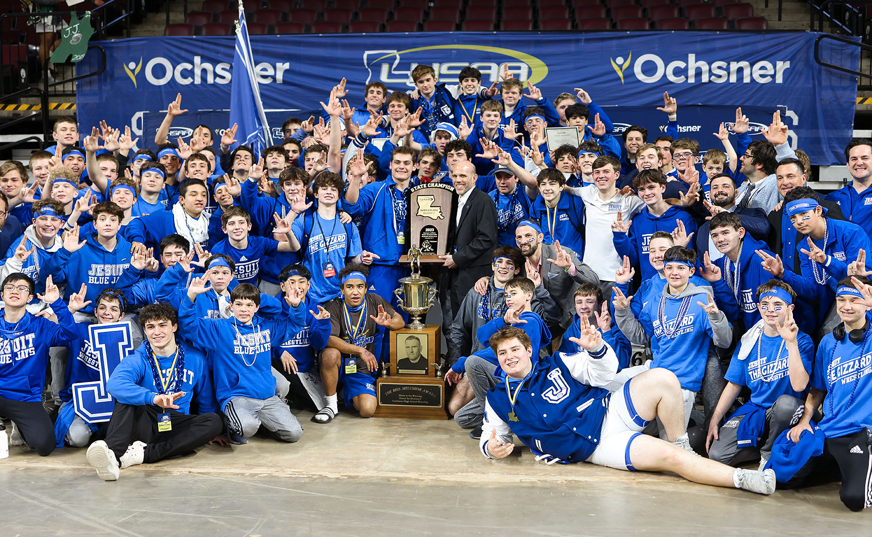 After a hard-fought three-way battle, Blue Jay wrestlers clinched the 2023 LHSAA Division I state title for the first time since 2009. Junior Spencer Lanosga sealed the victory with a 41-second pin that put that Jays ahead of Catholic from Baton Rouge.
