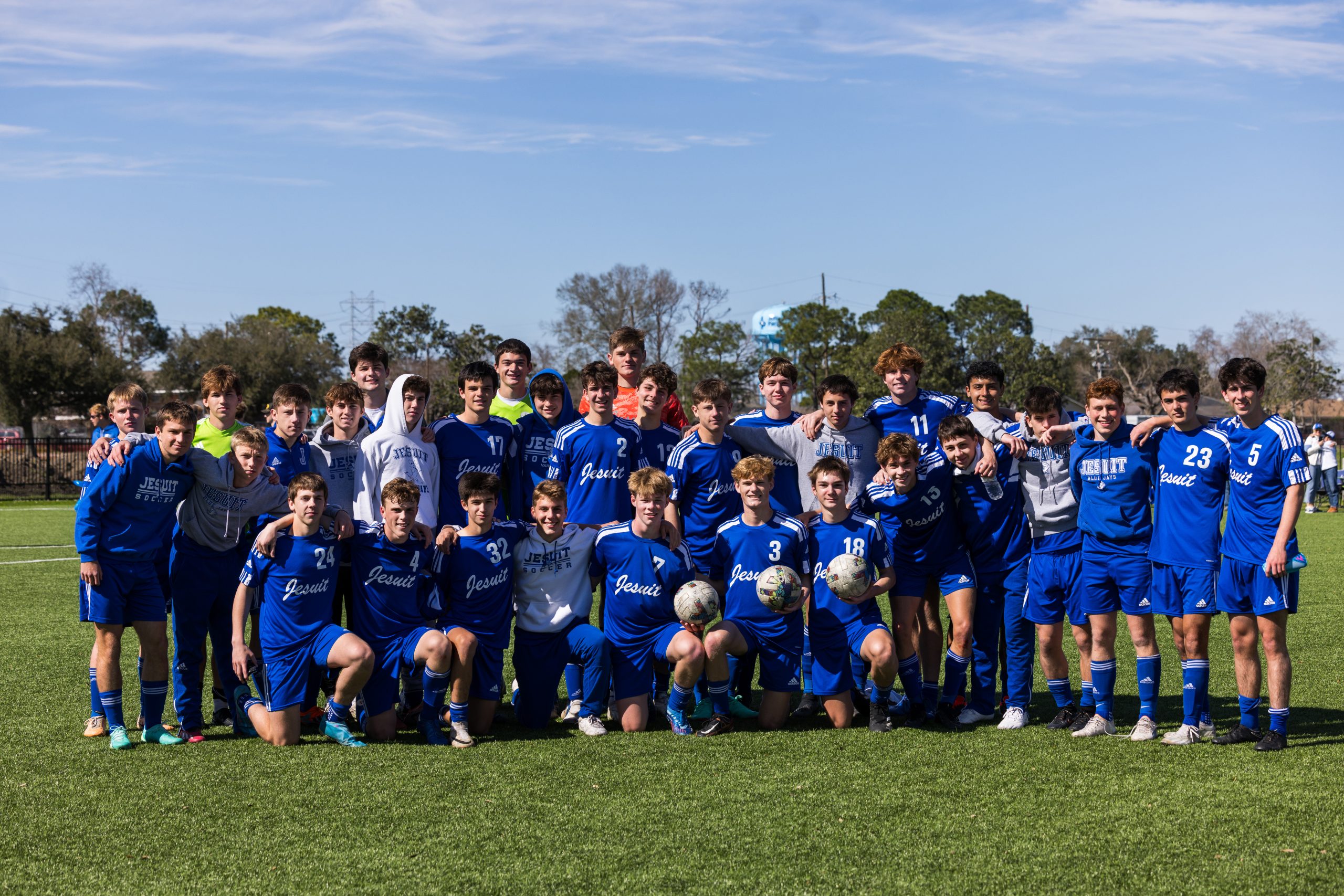 Following three consecutive LHSAA playoff victories, the soccer team advanced tonight to the 2024 Division I semifinals after a convincing 3-1 win over St. Amant. In light of the Blue Jays’ strong season record of 19-1-2, the Gators brought competitive play to Lafreniere to contest the Jays’ top-ranked post-season position, but stalwart performances across the entire field of play ensured a Jesuit victory on Shrove Tuesday.