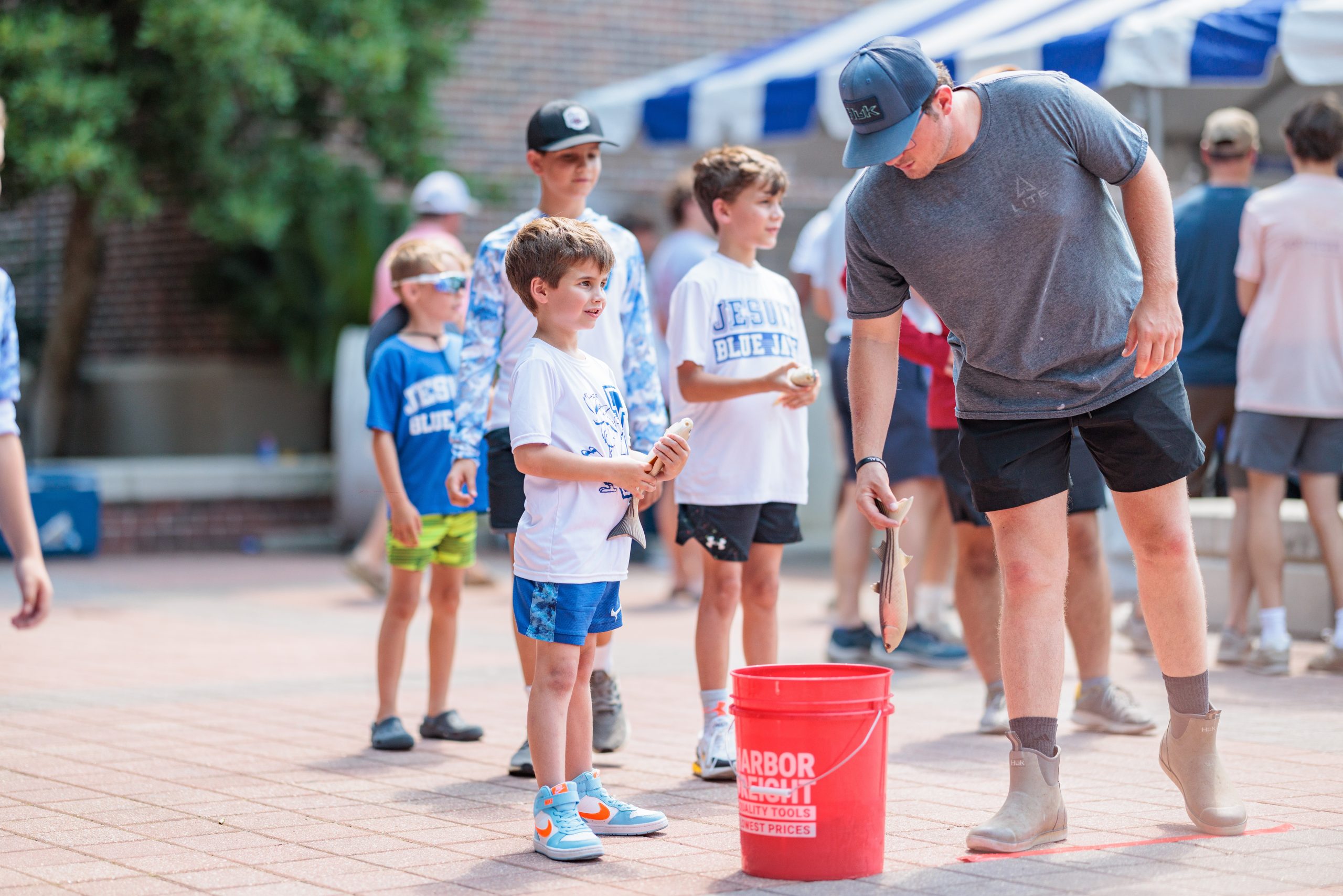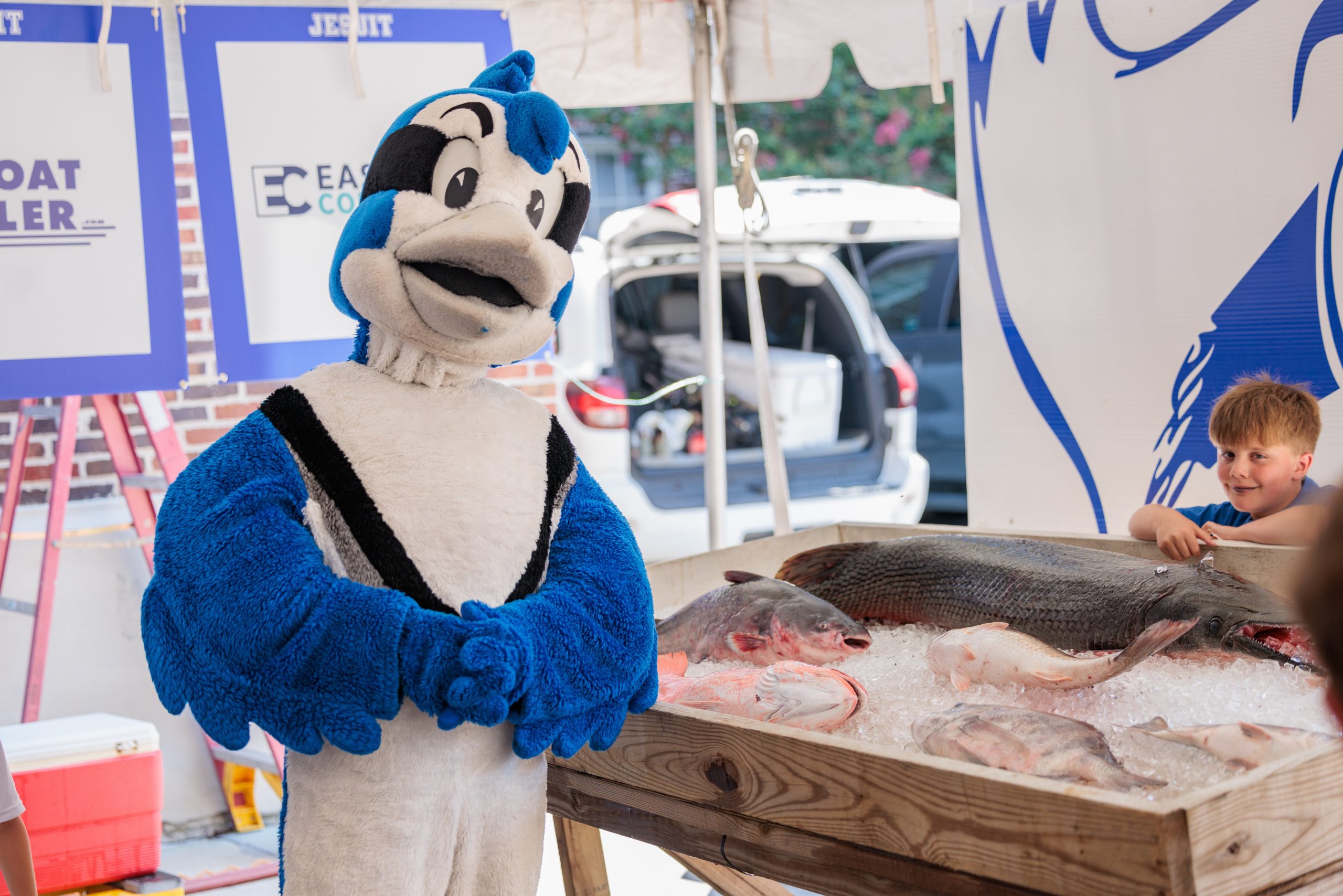 Under sunny skies and perfect fishing conditions, participants gathered for the weigh-in festivities. Many sported the event’s official long-sleeved camouflage print rodeo shirt, adding to the vibrant atmosphere. Highlights of the day included a rubber mullet toss for younger attendees, refreshing snowballs from Kona Ice, and Jayson making rounds across campus. Max Gruenig ’06 and his team cooked delicious fish plates on site, and the Blue Jay Shop was open for those looking to purchase blue and white merchandise.