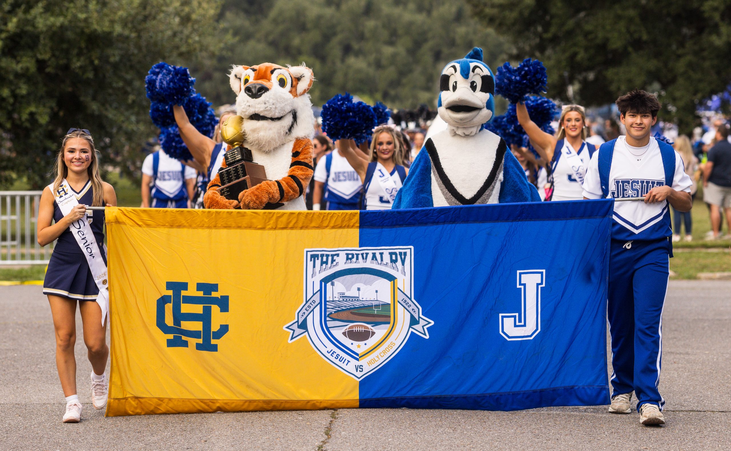 Before the evening clash, Jesuit’s annual rivalry tailgate brought together alumni, families, and friends under a sea of blue and white tents. The MCJROTC cooked its famed jambalaya alongside burgers and hot dogs, while the Blue Jay Shop offered spirit gear for fans of all ages. The Blue Jay and Holy Cross marching bands performed their fight songs before engaging in a lively drum-off as the mascots—Jayson and Thunder—led the parade of Jayettes, Carmelettes, cheerleaders, and band participants into Tad Gormley Stadium.