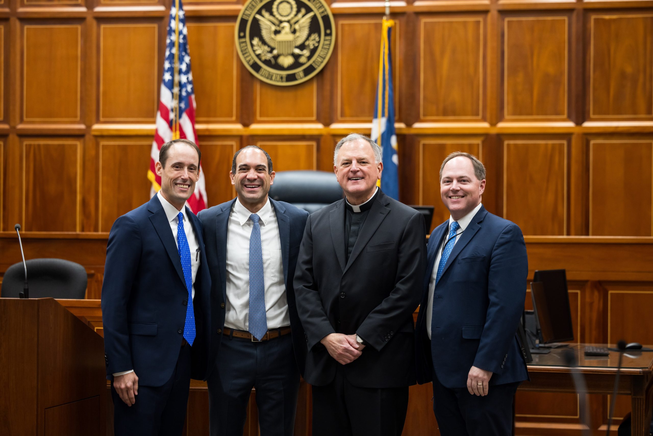 Nearly 100 Jesuit alumni—spanning classes from 1970 through 2019—gathered inside a newly renovated federal district courtroom for a special Continuing Legal Education program designed exclusively for Jesuit-alumni attorneys. Organized by the Jesuit Alumni Association in collaboration with Peter Mansfield ’96, Brandon Briscoe ’98, and U.S. District Judge Jay Zainey ’69, the complimentary event reflected the deep commitment of Jesuit graduates who continue to distinguish themselves in the legal profession while remaining devoted to their alma mater. The program featured two signature presentations: Chris Zainey ’01 offered “Ethics Goes to the Movies,” and Fr. Penn Dawson, S.J. delivered “Ignatius and Professionalism in the Practice of Law: Integrating a Healthy Work & Faith Life.”