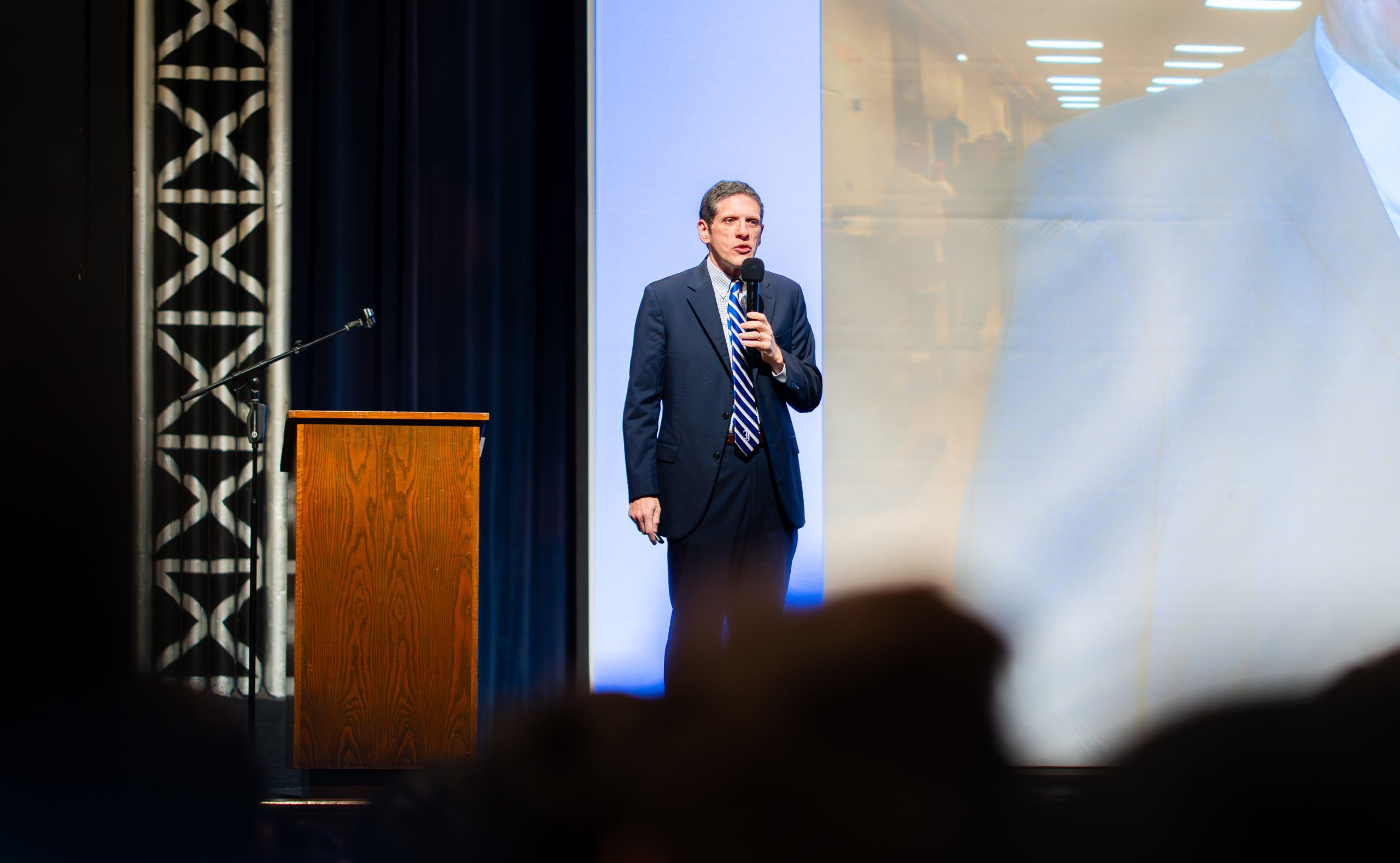Throughout the keynote, Massa challenged students to “do the work,” arrive early, stay late, and remain open to learning while grounding their ambitions in Jesuit values, reminding them to find purpose and meaning in all they do.