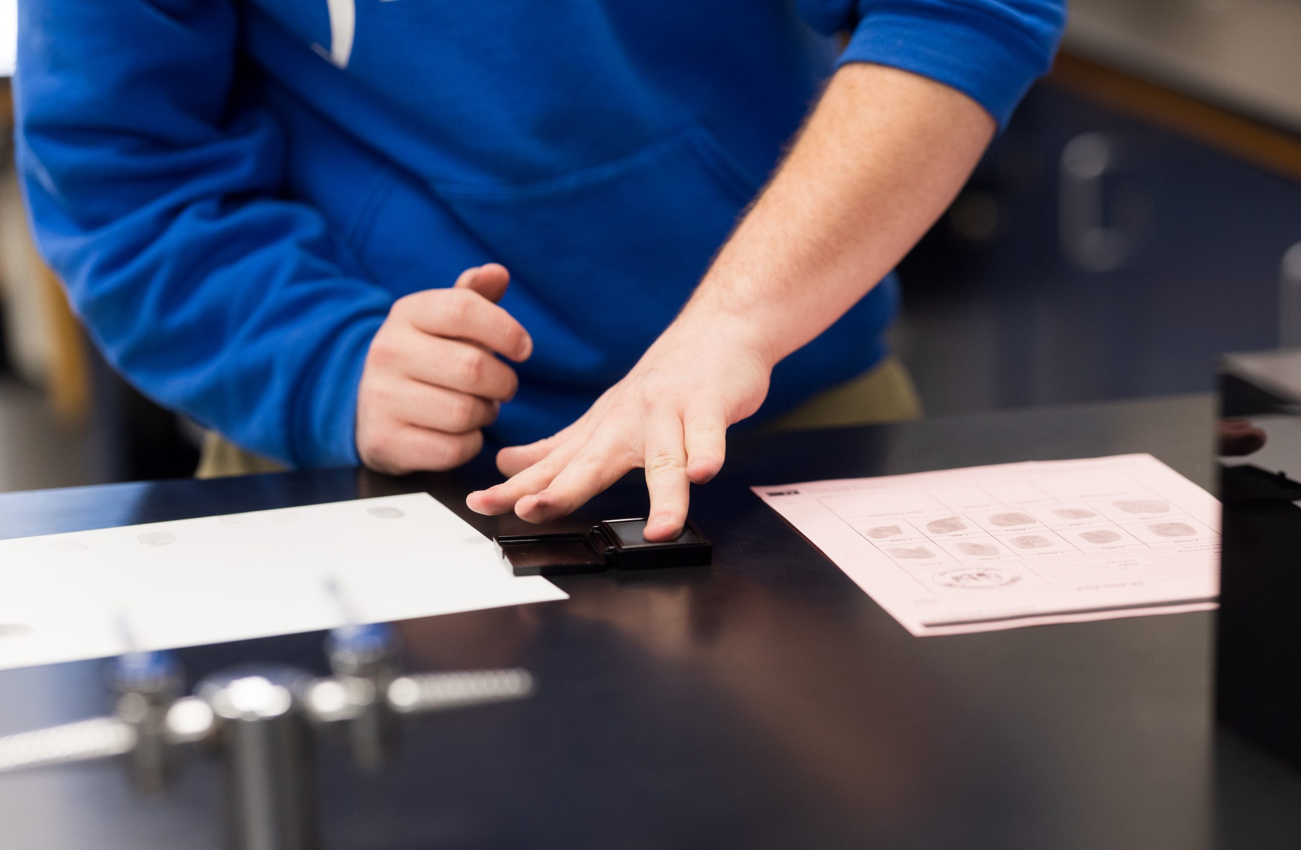 In class, students pursue clear, measurable learning goals. For example, a fingerprint unit aims for students to understand the biological basis and forensic value of fingerprints and to properly collect, classify, and analyze fingerprints using standard forensic techniques. To meet that goal students create their own 10-Print cards, learn to identify the three primary fingerprint patterns (loops, whorls, and arches), and subclassify prints. They practice developing latent prints using a variety of reagents and methods — ninhydrin, iodine fuming, cyanoacrylate (superglue) fuming, and traditional powder dusting — and apply those skills in simulated casework to match crime-scene prints to suspects.