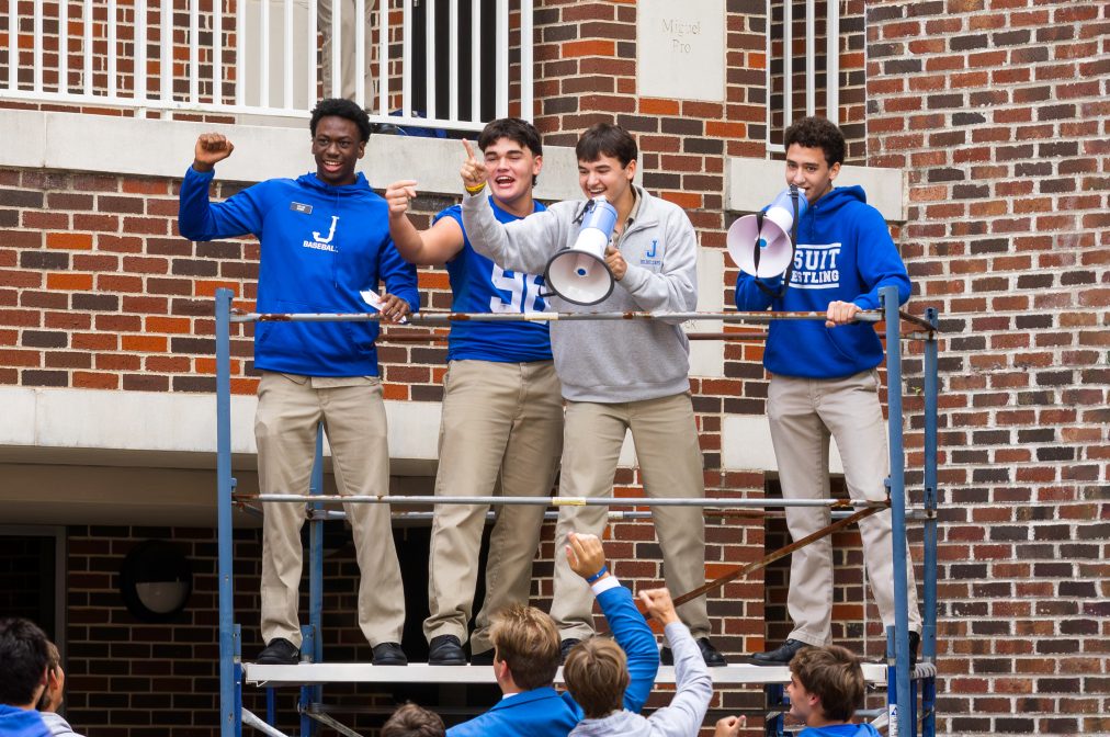Blue Jays rally in Traditions Courtyard ahead of Friday night’s matchup for Gizzard Gameday, broadcast from a handmade sports desk crafted by senior Cole Puneky and hosted by Spencer Waguespack ’25. Lunchtime hype peaked as senior Zach Lagraize lined up and drilled a field goal during student activities.