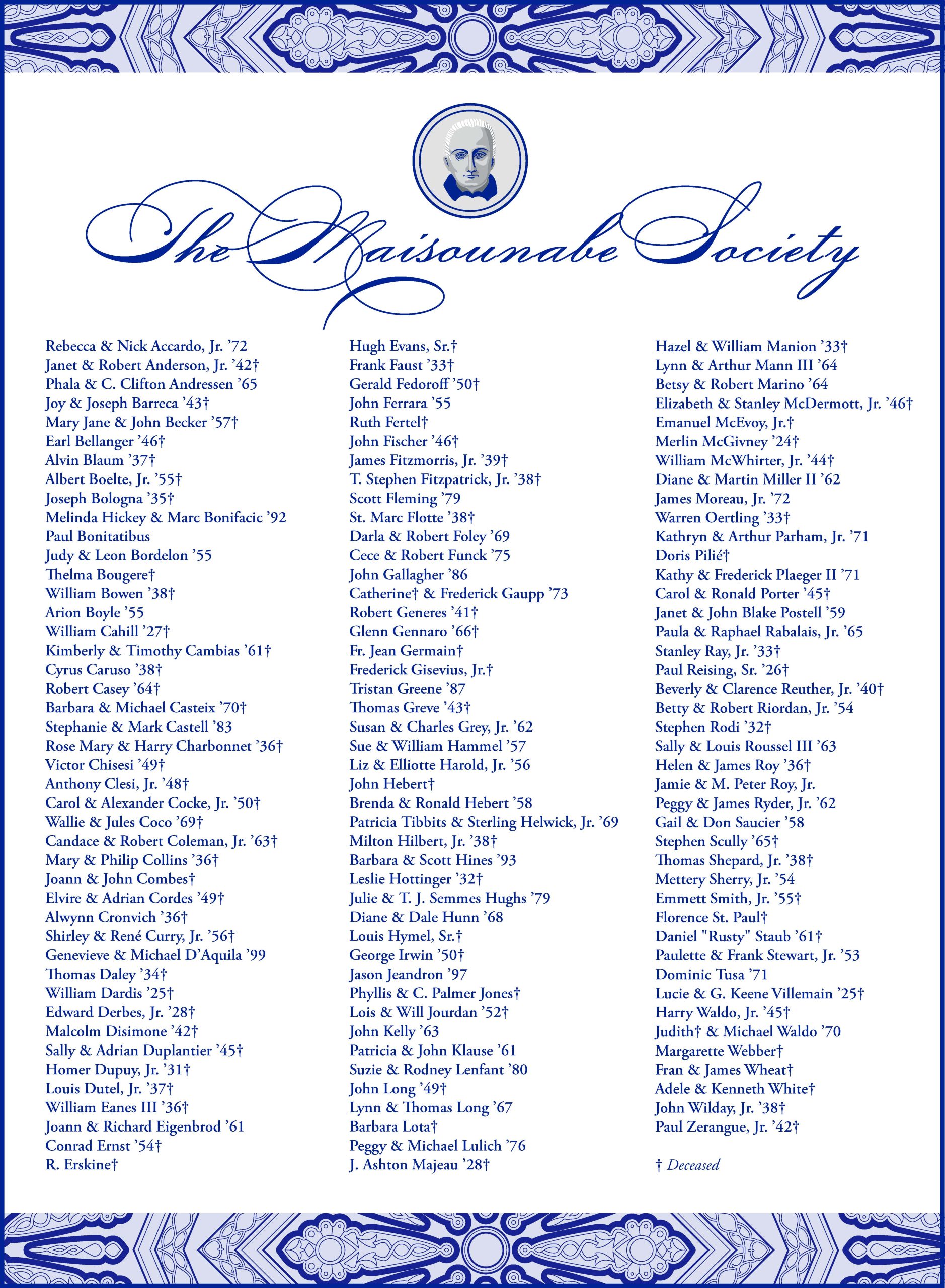 The Maisounabe Society—formed in 1987 and named in honor of Fr. Jean Baptiste Maisounabe, S.J., the founder of Jesuit High School of New Orleans—recognizes benefactors who have provided planned gifts to Jesuit High School. Such planned gifts are typically made through wills and bequests, retirement accounts, charitable gift annuities, charitable trusts, and life insurance policies.