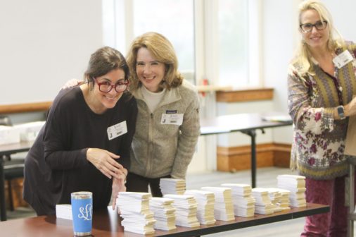 Blue Jay mothers and #Back2Banks Bazaar volunteers Nicole Ciaccio, Stacey Lacour, and Beth Schibler work together in St. Ignatius Hall to organize and stuff Bazaar raffle tickets. The trio of volunteers spent their early morning hours setting up as other volunteers flooded in to Ignatius Hall to complete the task at hand. On Tuesday, March 3, students will receive their Bazaar raffle tickets in an envelope that will also contain information on ticket-sale incentives. Alumni families and parents of current Blue Jays are encouraged to sponsor the Bazaar, sign up to volunteer, and/or pre-order their Bazaar T-shirts!