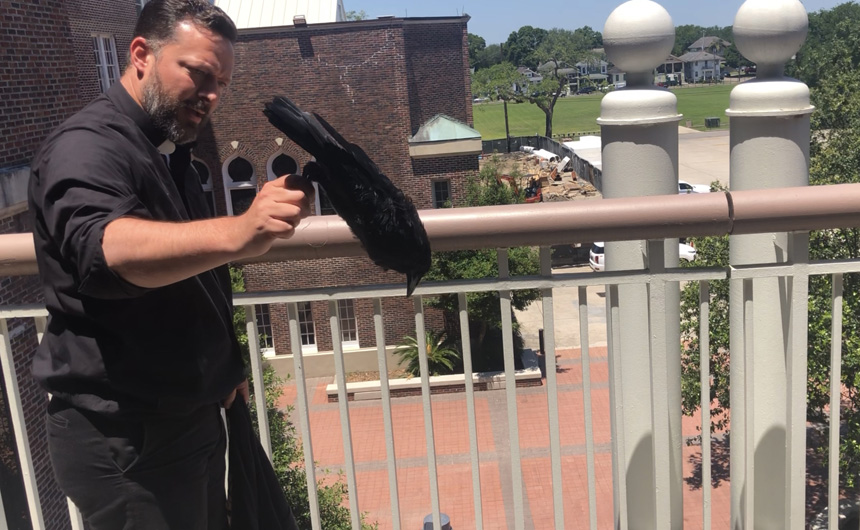 What do crows and blue jays have in common? What many might know is that both are members of the same family of birds known as Corvids. What few will know is that, with the hallways more spacious than normal during Covid-19 restrictions, both have made a home a Carrollton and Banks. One of the crows that regularly circles campus made its way into the school building on Monday and flew the hallways normally trafficked by Blue Jays. Good thing Jesuit’s interim president, Fr. John Brown, S.J., is no stranger to handling eccentric animals. Watch the video of Fr. Brown releasing the crow into the school yard.