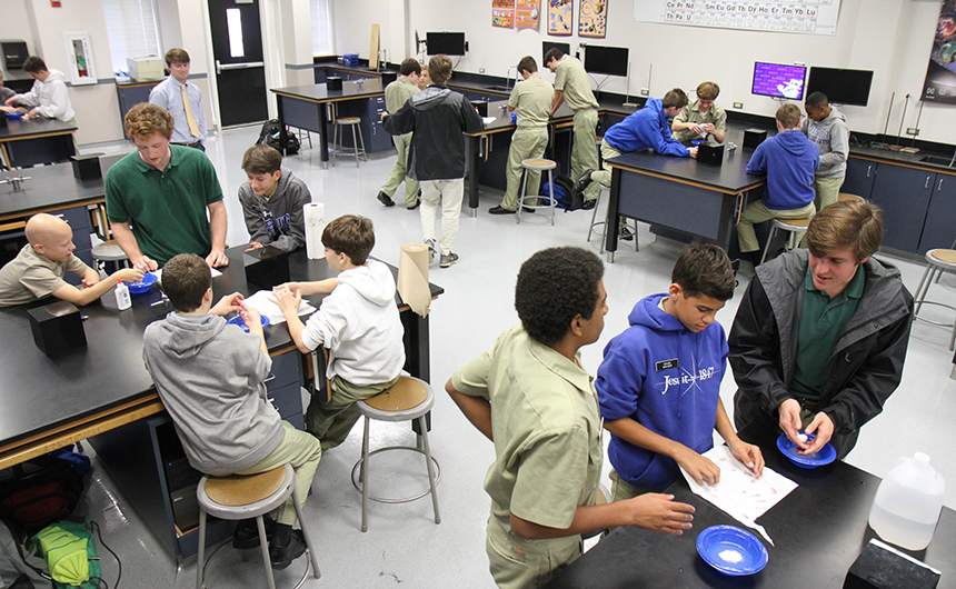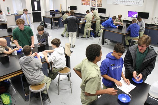 Three alumni returned to Carrollton and Banks to lead an experiment in Mr. Alex Nay’s science class. Dillon Knight ’15 (foreground, at left), Dan Edmund ’15 (foreground, at right), and Andrew Amedee ’15 (background, center) help Blue Jays turn white craft glue and a mixture of borax and water into a slimy substance similar to putty. Following the experiment, the alums discussed with students how and why the chemical reaction took place. Knight, Edmund, and Amedee are freshmen at LSU.
