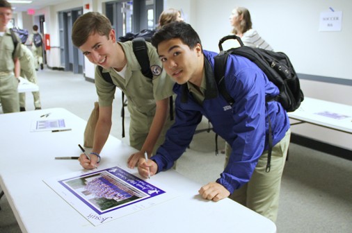 Student athletes filed through the first floor hallway today to sign mats that will frame photos of this year’s sports teams. After penning their own names, sophomores Nathan Alvarez (left) and Gregory Buisson took a look at the photo of their varsity track and field team. These one-of-a-kind signature-filled gifts will be auctioned off at the Blue Jay Bazaar on Saturday, March 19. Blue Jays who still need to sign their team mats may do so Tuesday and Wednesday during lunch.