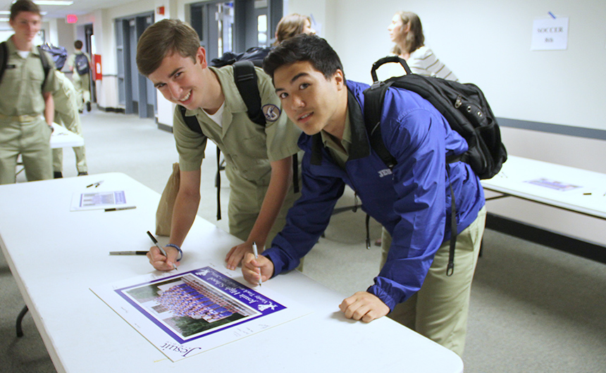 Student athletes filed through the first floor hallway today to sign mats that will frame photos of this year’s sports teams. After penning their own names, sophomores Nathan Alvarez (left) and Gregory Buisson took a look at the photo of their varsity track and field team. These one-of-a-kind signature-filled gifts will be auctioned off at the Blue Jay Bazaar on Saturday, March 19. Blue Jays who still need to sign their team mats may do so Tuesday and Wednesday during lunch.