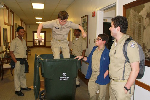 Pre-freshman Jake Mercer shows it’s not easy bein’ green as he puts his all into compacting recyclables during the Green Club‘s pick up Thursday afternoon. Mercer is joined by fellow club members (clockwise from left) senior Akin Pounds, junior Jandon Briscoe, pre-freshman Ryan Castellon, and senior Victor Castellon. The Green Club focuses on school-wide recycling as well as promoting awareness of a variety of environmental issues. The club is moderated by Ms. Lori Fasone.