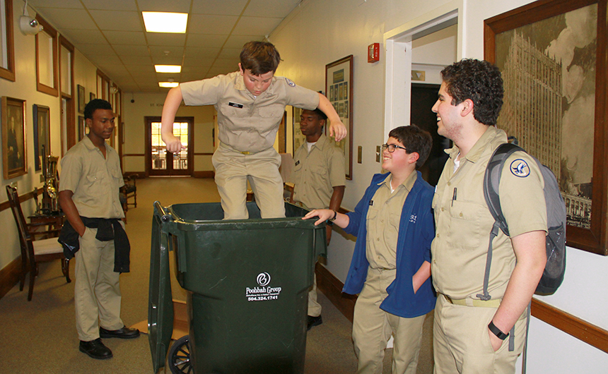 Pre-freshman Jake Mercer shows it’s not easy bein’ green as he puts his all into compacting recyclables during the Green Club‘s pick up Thursday afternoon. Mercer is joined by fellow club members (clockwise from left) senior Akin Pounds, junior Jandon Briscoe, pre-freshman Ryan Castellon, and senior Victor Castellon. The Green Club focuses on school-wide recycling as well as promoting awareness of a variety of environmental issues. The club is moderated by Ms. Lori Fasone.