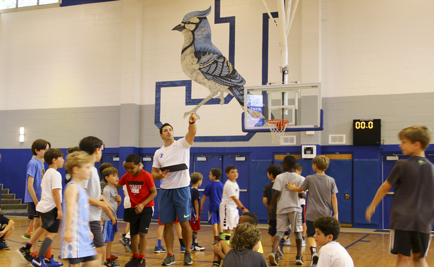 For two weeks at the beginning of June, the newly-renovated gym becomes Biddy Basecamp, as young players from ages 6-11 descend upon the hardwood for summer basketball camp. With both morning and afternoon sessions, the camp develops fundamentals, hosts team play and individual competition, and strengthens understanding of the game through instructional videos. Assistant basketball coach Jonathan Hernandez ’00 calls out the schedule of the next competition as players run to their spots.