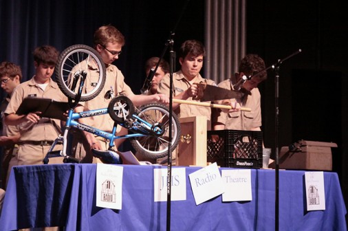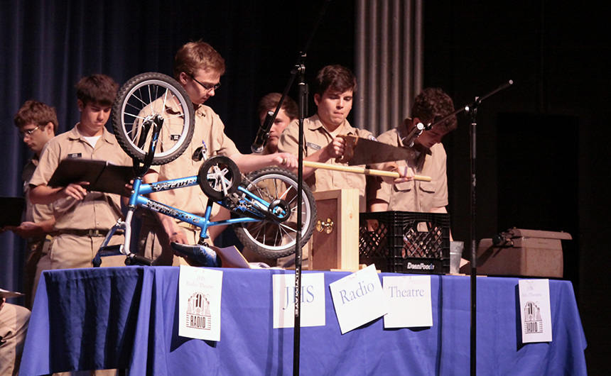 Seniors David Stahl and Austin Galy serve as foley artists performing sound effects in the Public Speaking class’ Radio Theatre performance of “The Wright Brother’s First Flight” by John De Lancie and Leonard Nimoy. The presentation, which served as a portion of the students’ final exam for the class, took place in the Auditorium during 4th period and was attended by fellow Blue Jays, faculty, and staff.
