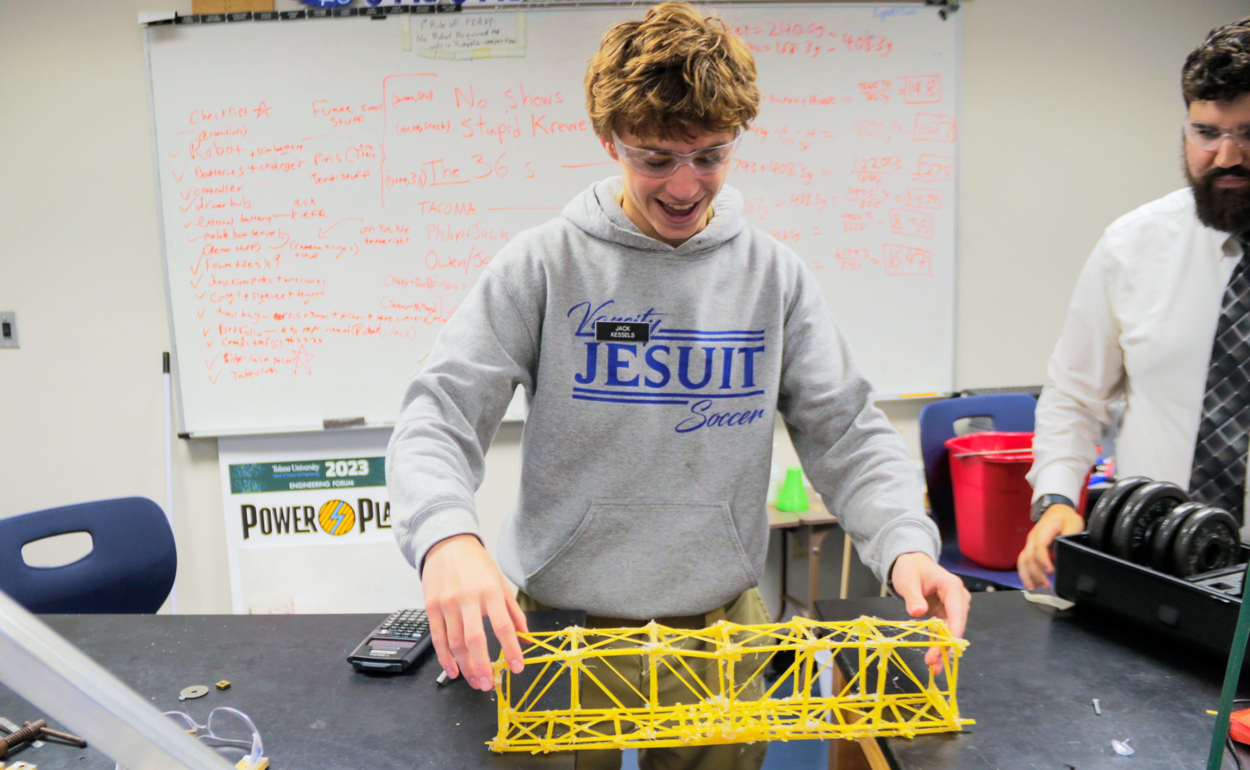 Students in Dr. Wayne Wagner’s ’16 physics class were tasked with constructing “spaghetti bridges” in order to better understand how structures resist specific forces. Junior Jack Kessels sets up his bridge across the gap as Mr. Travis Kieff ’17 gets ready to load the bridge with weights. In increasing increments, weights are added to test the structural integrity of the bridge until the weight is too much to bear. Snap!